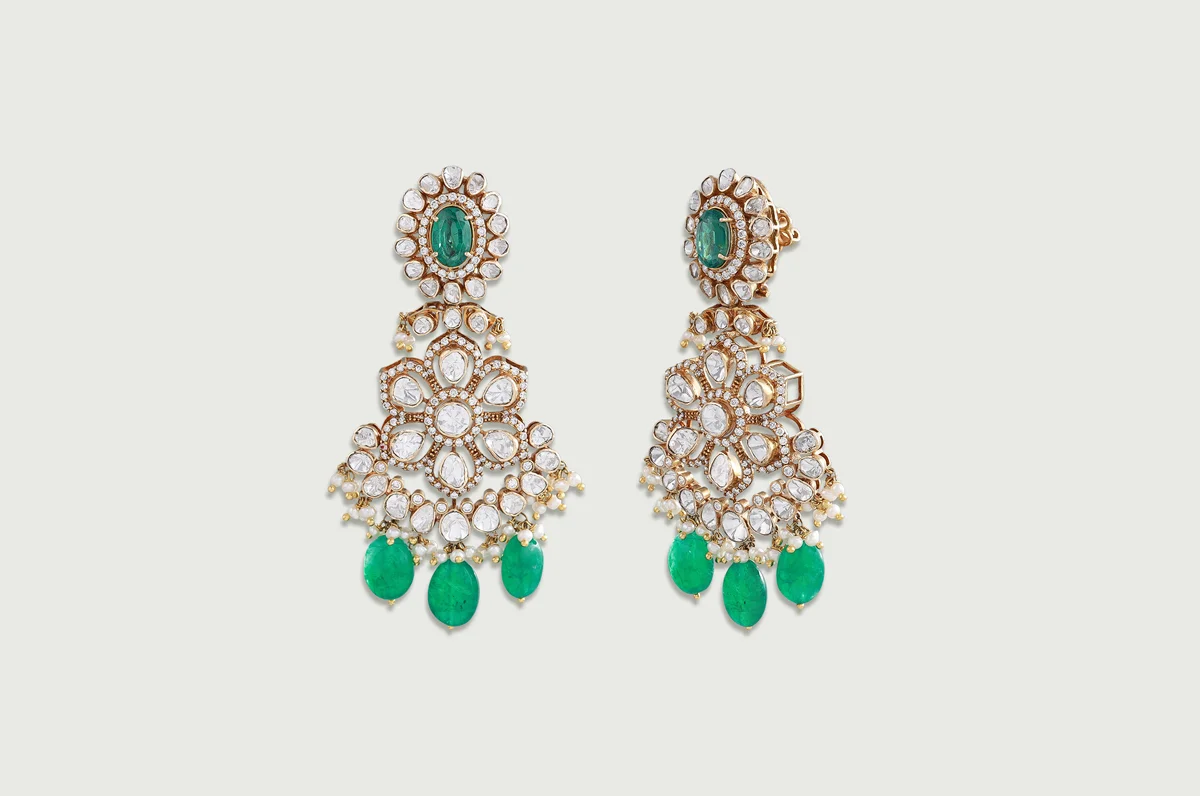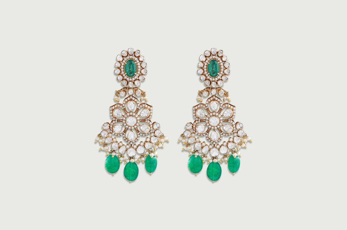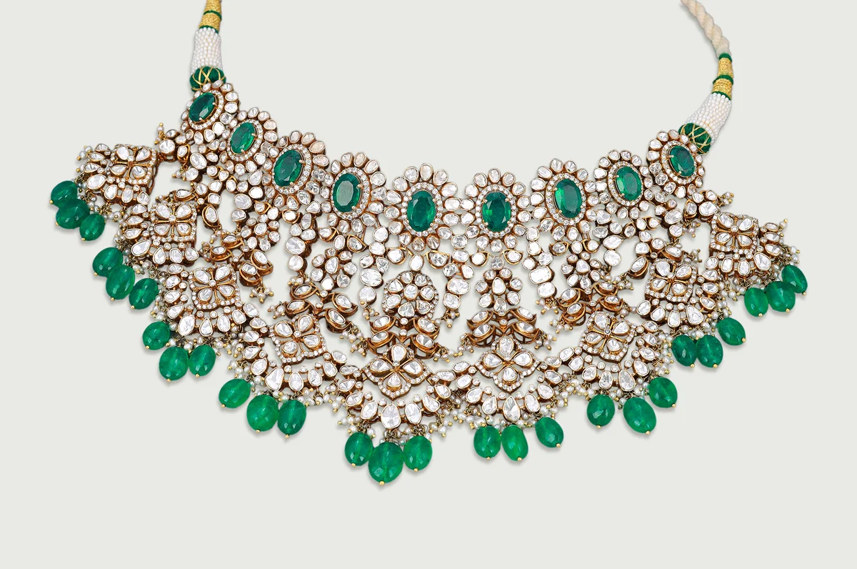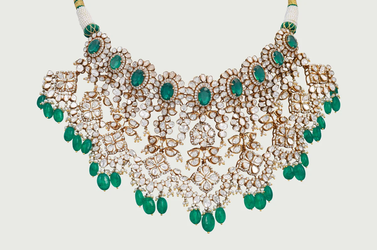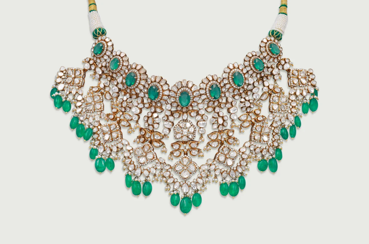 A series of Polki motifs crowned with oval emeralds forms a rhythmic, architectural neckline. The design expands downward into detailed lattices accented with emerald beads, creating a gentle shimmer with every movement.