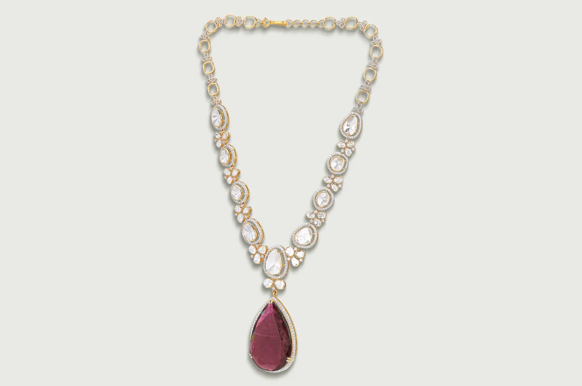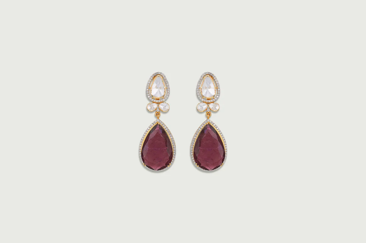 Lab-grown Polki leads into deep ruby–garnet drops, each stone set openly to reveal its natural light and texture. The earrings and pendant necklace mirror the same refined silhouette — luminous Polki graduating into a rich, faceted centrepiece.