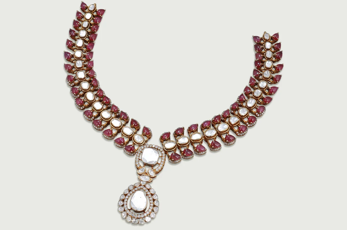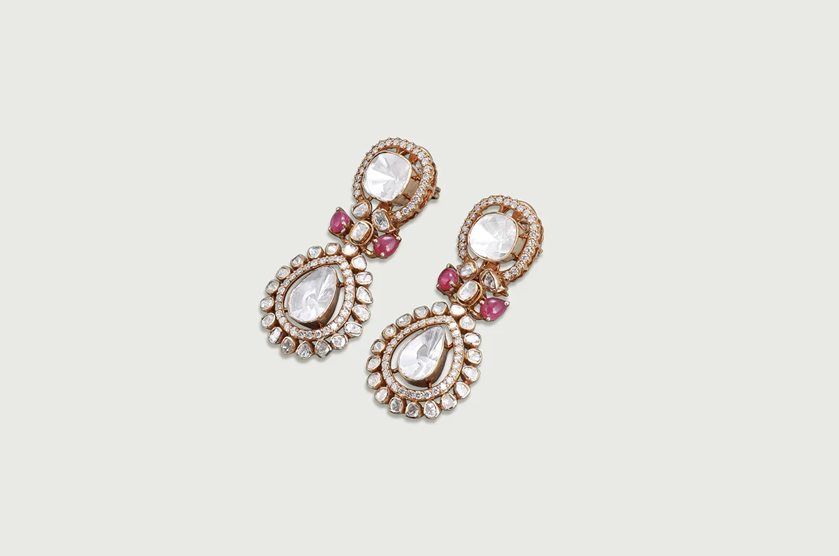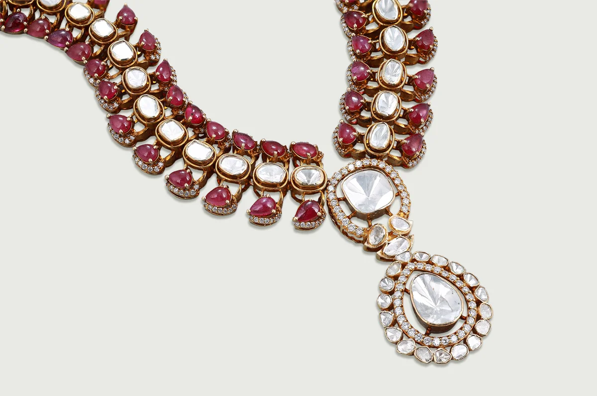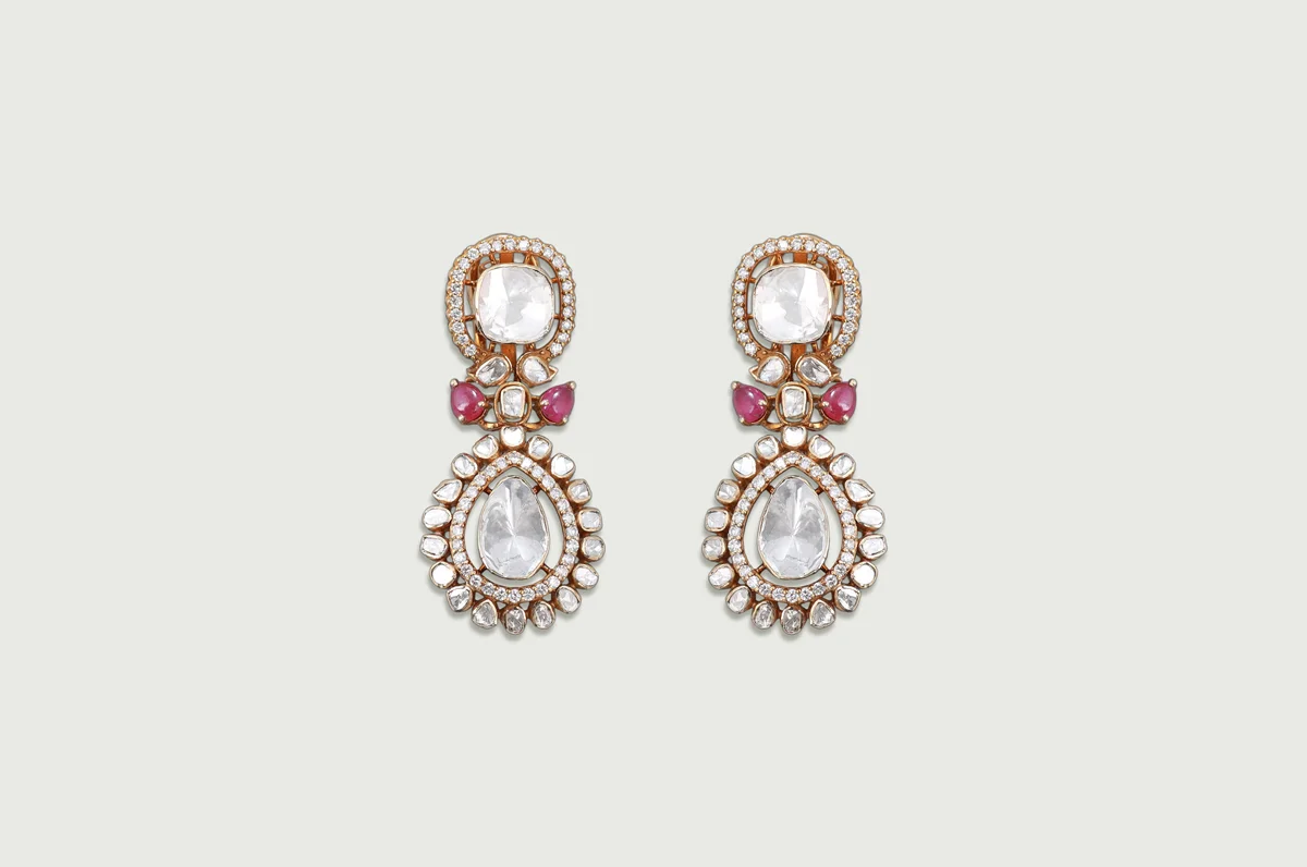 Lab-grown Polki in open-settings reflect a quiet glow, framed by saturated ruby petals that lend a rhythmic, almost floral geometry. The Victorian-polished gold introduces warmth and nostalgia, elevating the central Polki drop into a true focal point.