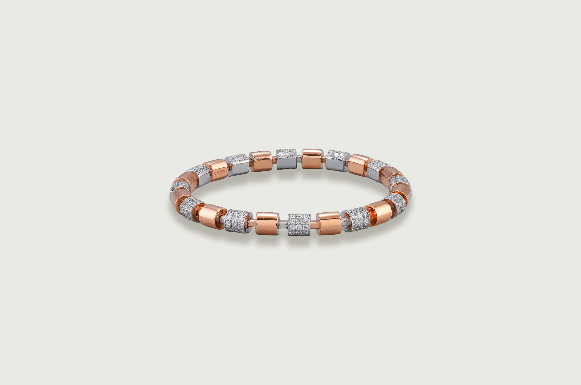 A rhythmic sequence of rose-gold and white-gold links creates a contemporary interplay of colour and texture. Each pavé-set segment adds a restrained brilliance, offering versatility from boardroom to evening wear.