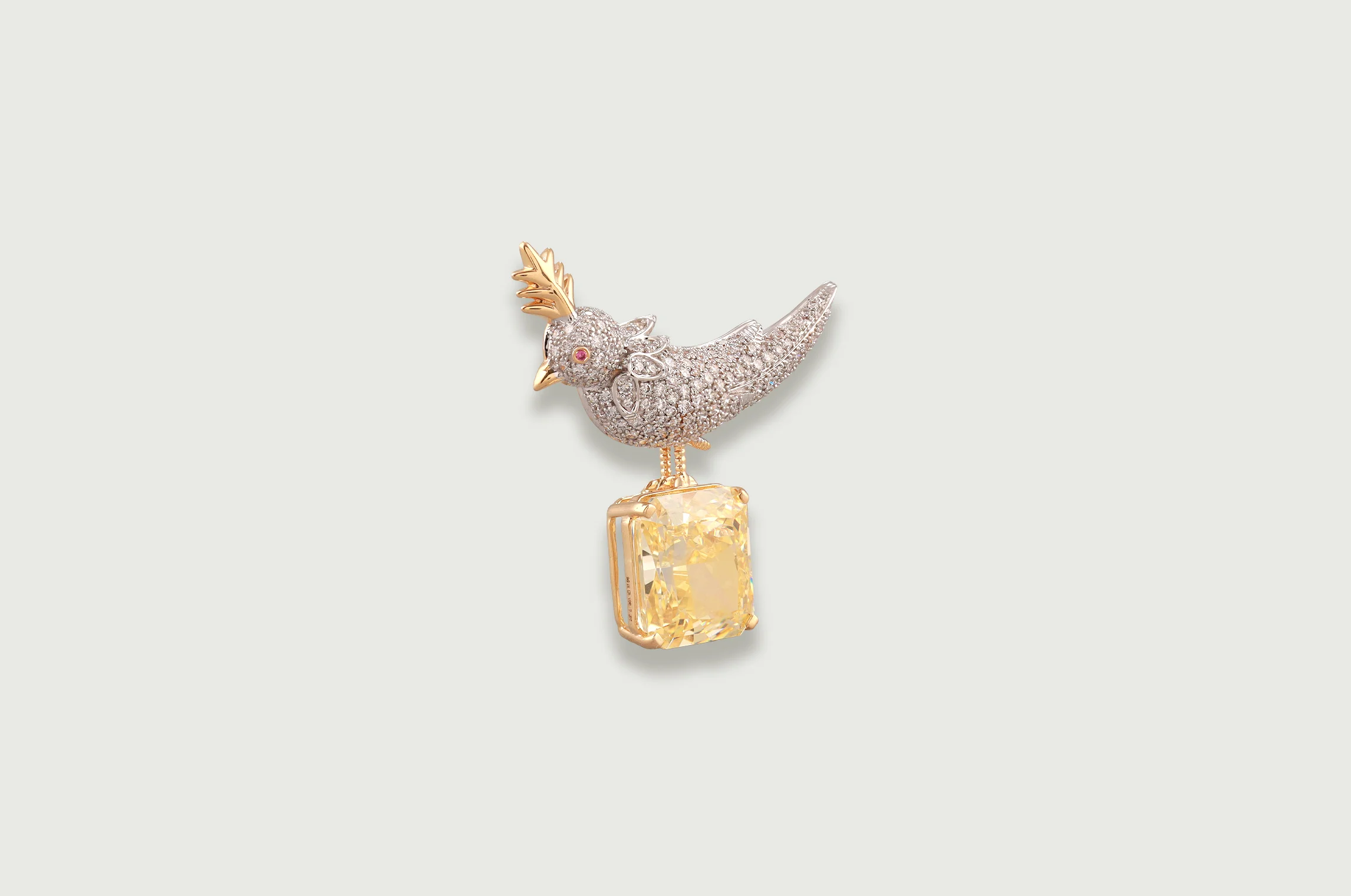 A sculpted bird form, pavé-set in brilliant lab diamonds, perches atop a striking yellow emerald-cut stone. Playful yet exquisitely detailed, this brooch celebrates personality and artistry — perfect for men who enjoy conversation pieces with refined charm.