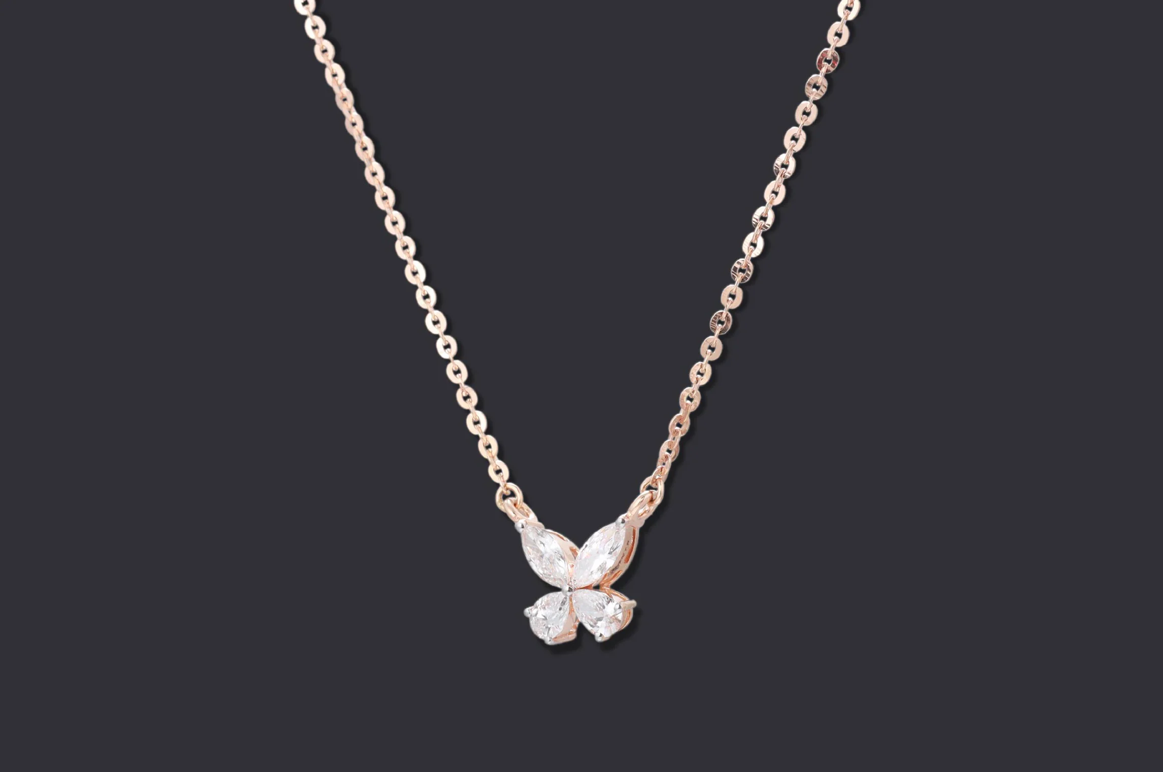 Four marquise and pear-cut diamonds set in prongs form a delicate butterfly motif, suspended on a rose-gold chain. Light, feminine, and symbolic of transformation, this pendant brings a soft grace to professional wear while carrying an aura of modern luxury.