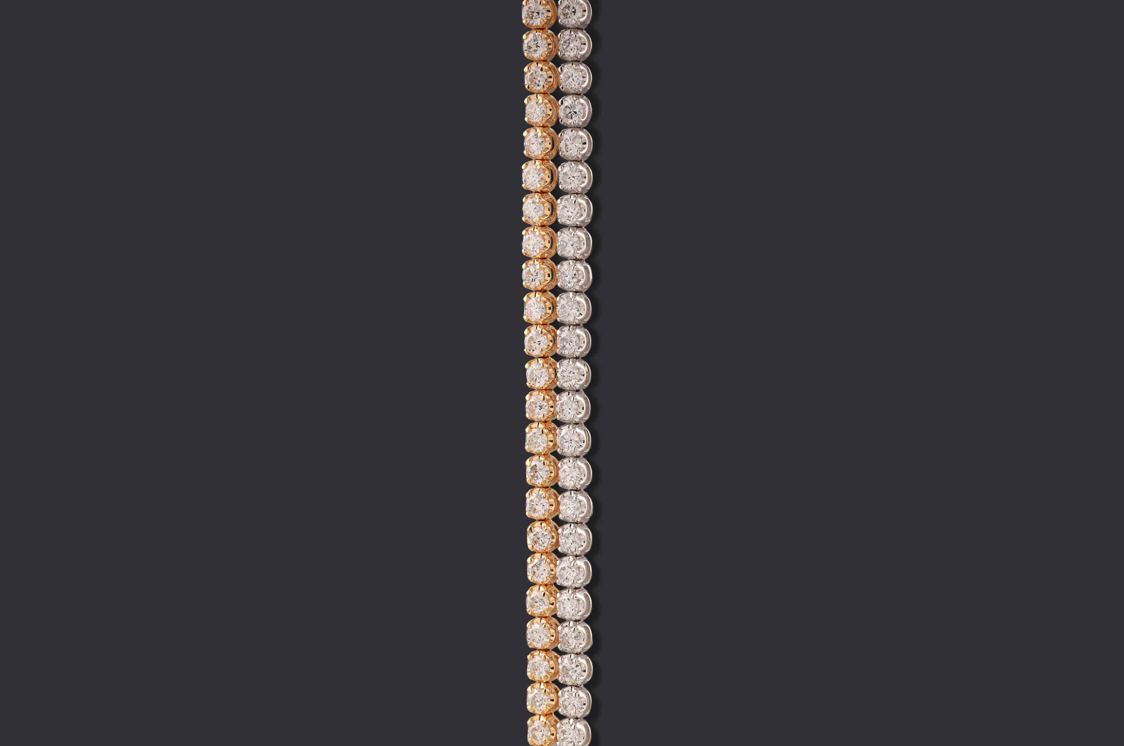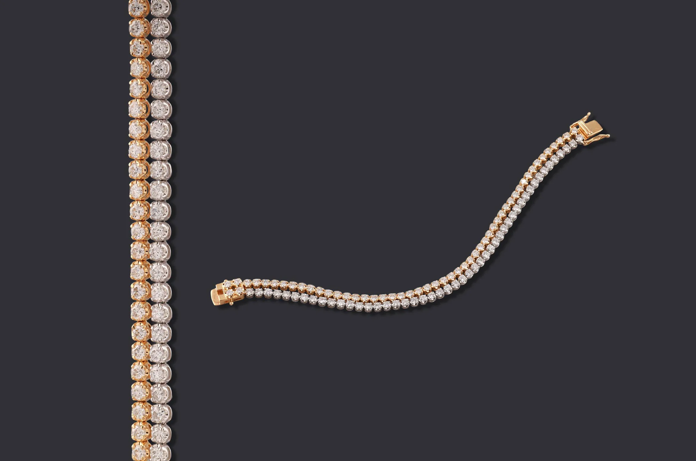 Two parallel rows of hand-set lab-grown diamonds flow seamlessly across a foundation of dual gold finishes — radiant yellow gold and luminous white gold. The interplay of warm and cool tones enhances the brilliance of each stone, giving this everyday essential a versatile, contemporary edge while retaining timeless elegance.
