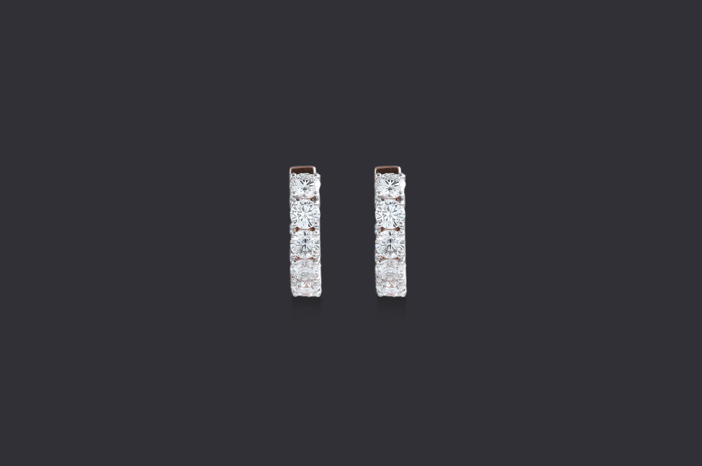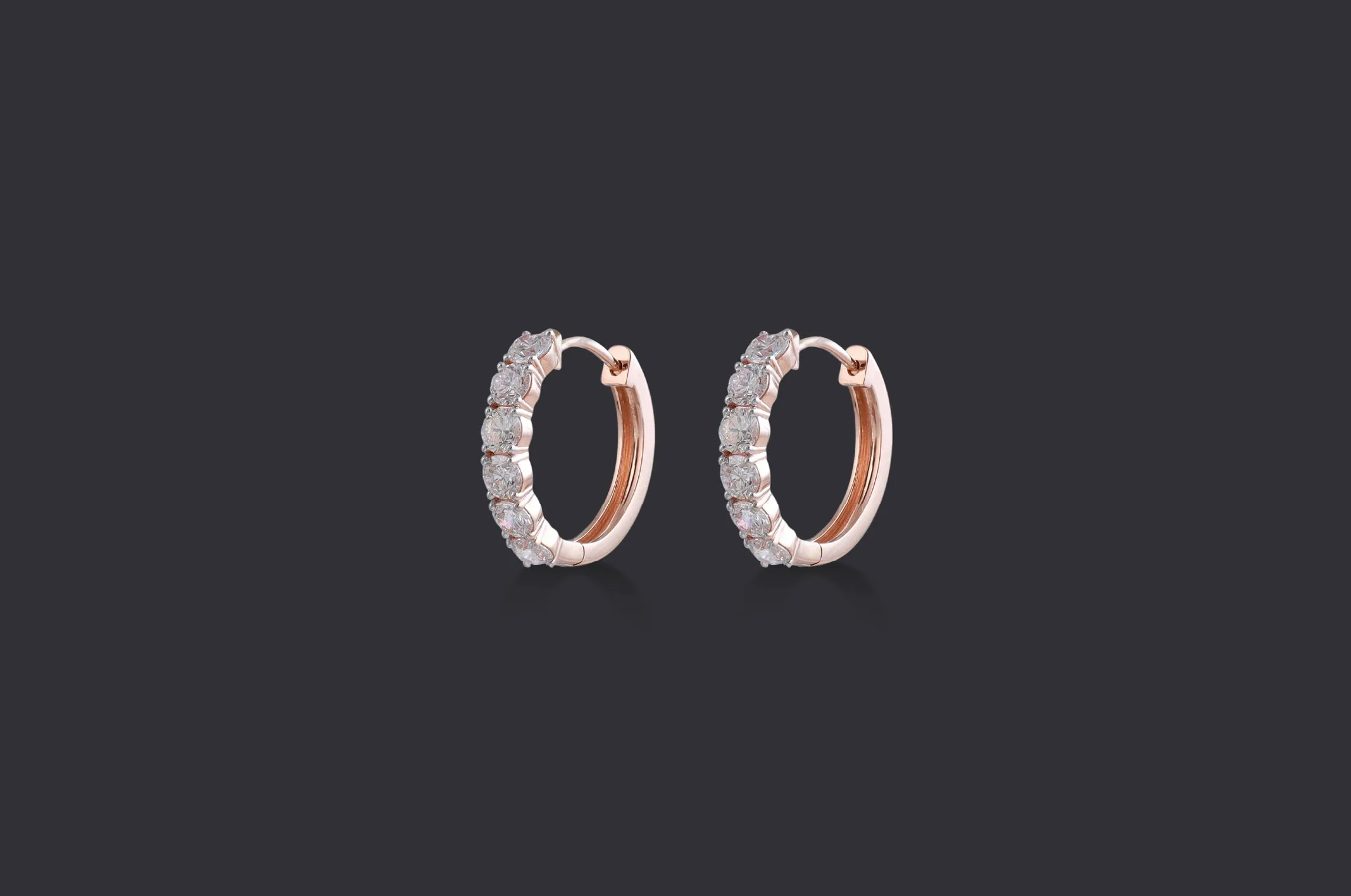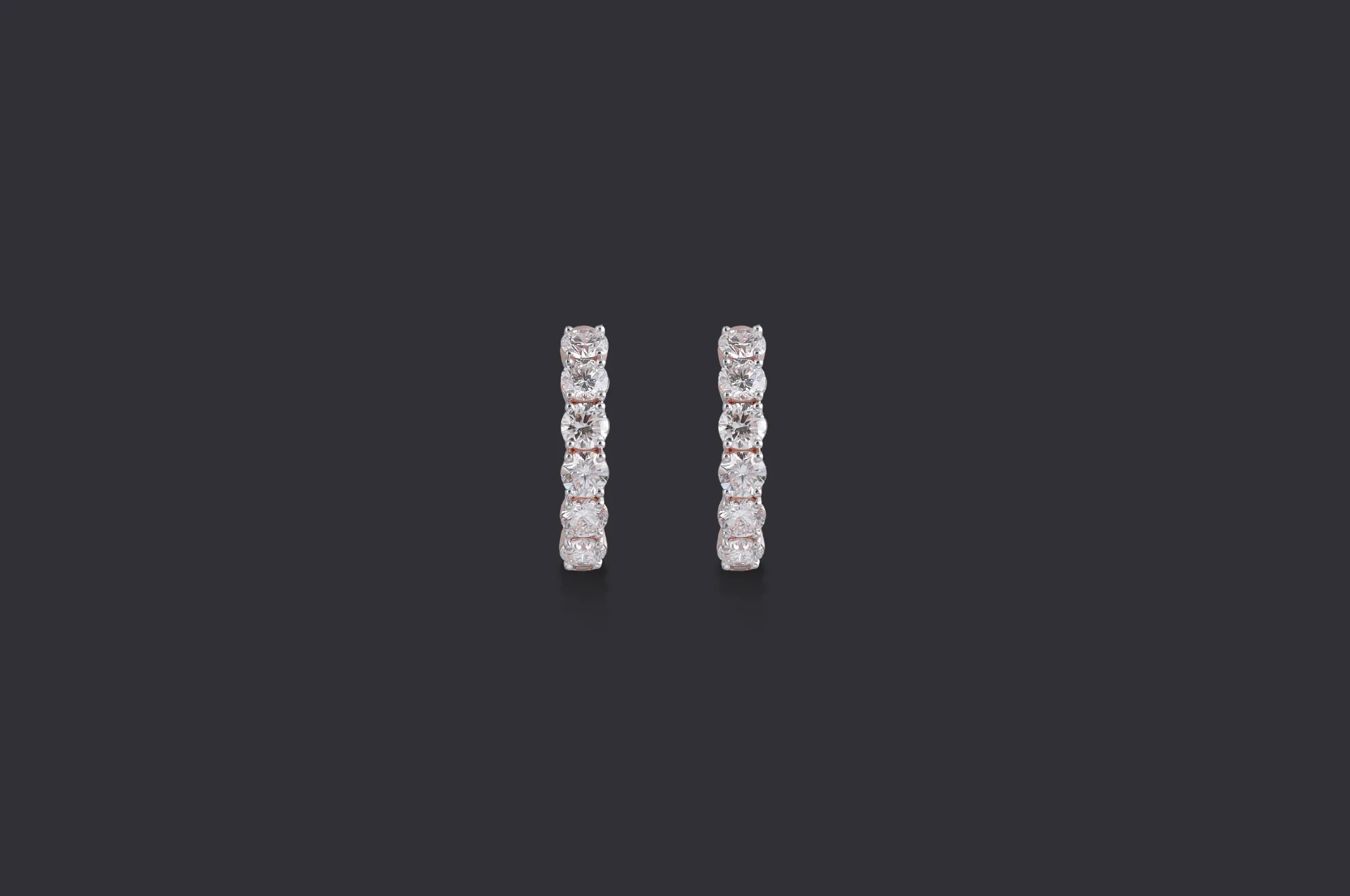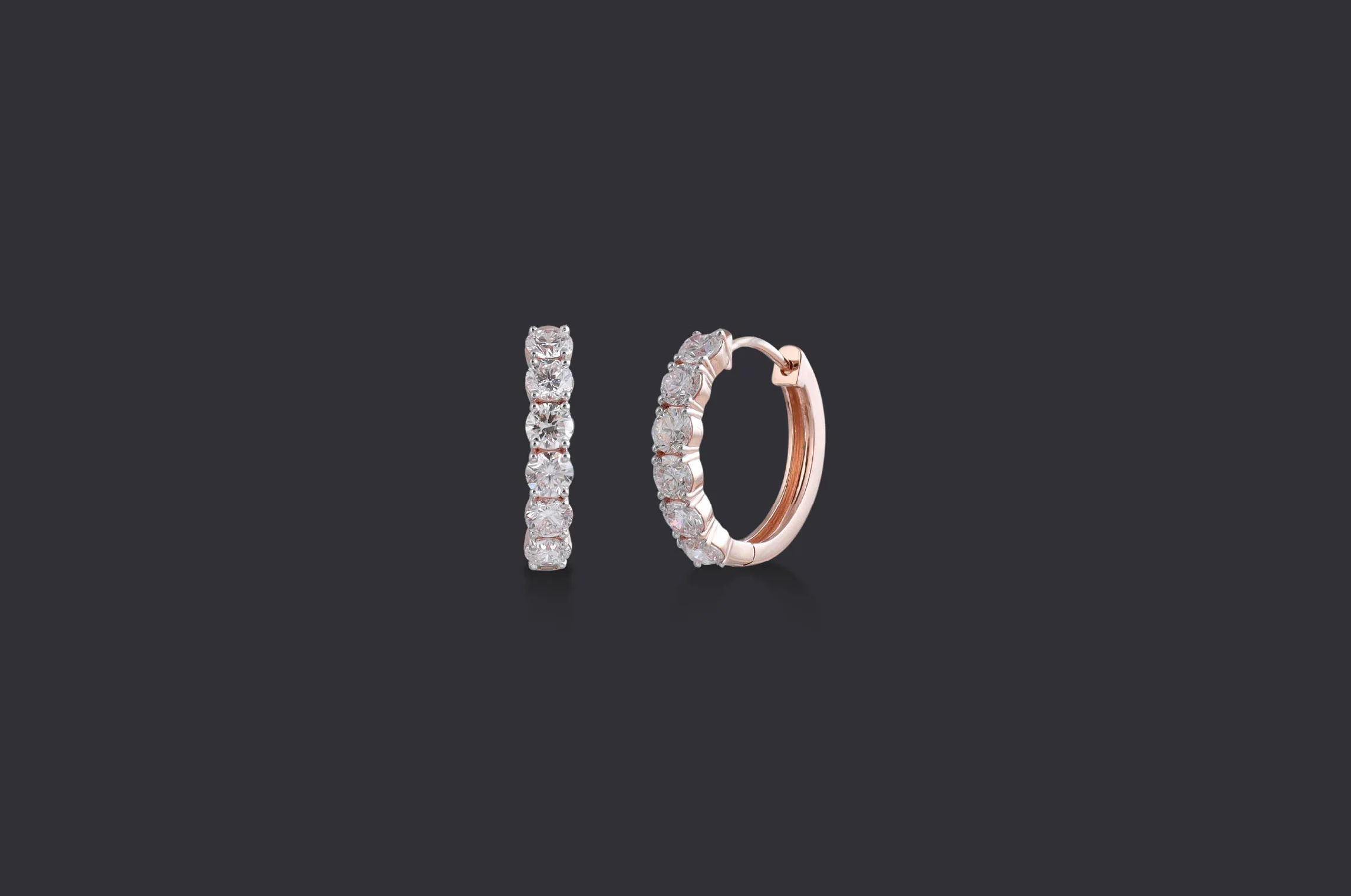 Crafted in rose and with white finish prongs, these hoops feature prong-set round brilliants that catch light at every angle. The warm-cool contrast of dual gold finishes enhances their modernity, making them versatile companions from day to night.