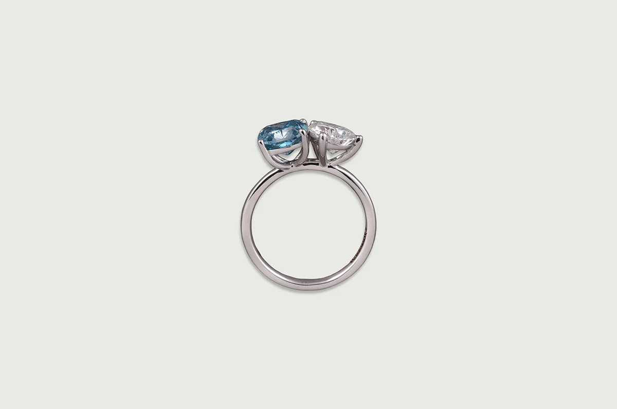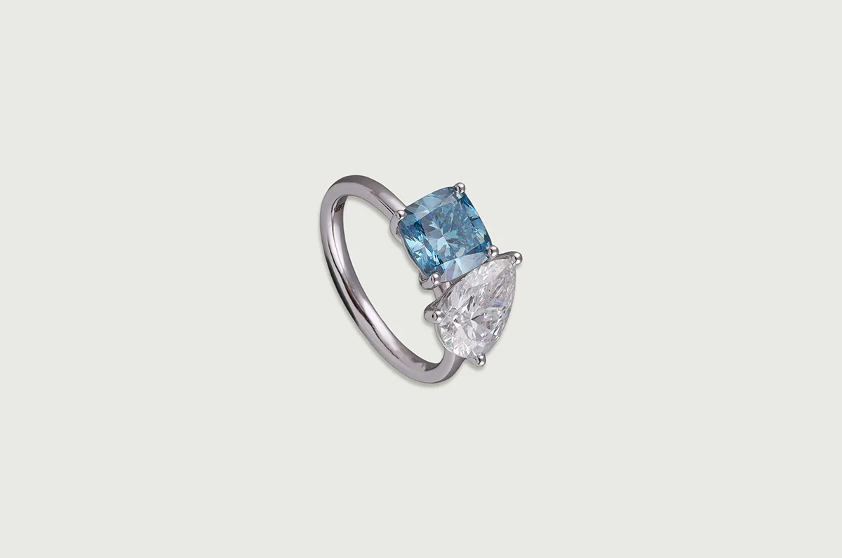 A cushion-cut Blue lab-grown diamond pairs with a pear-cut lab-grown diamond in a fluid, open silhouette.