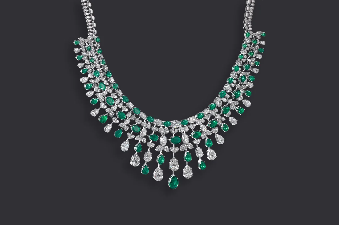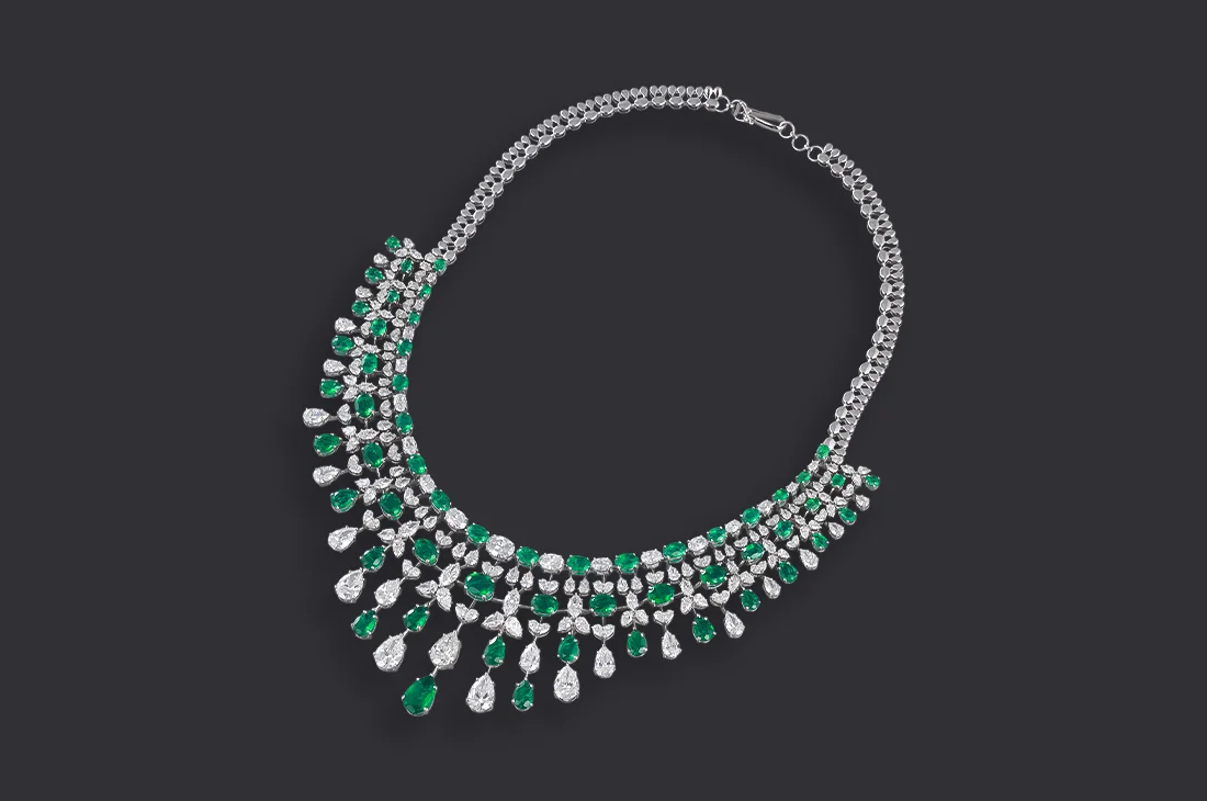 An opulent cascade of lab-grown diamonds and emeralds unfurls in layers of intricate artistry. Oval and pear-shaped pieces are meticulously set to create a rhythmic lattice, where emerald brilliance and diamond fire interplay in dazzling harmony. The earrings mirror the necklace’s sweeping silhouette, completing a set that captures the essence of celestial grandeur—crafted to embody both movement and majesty.