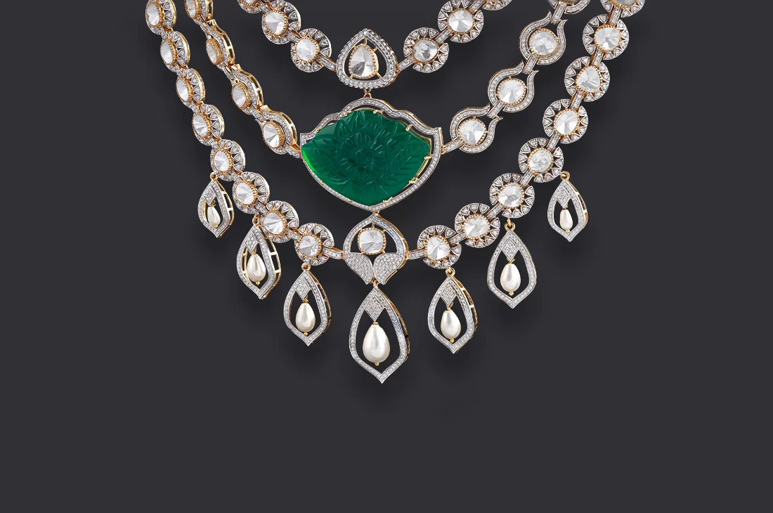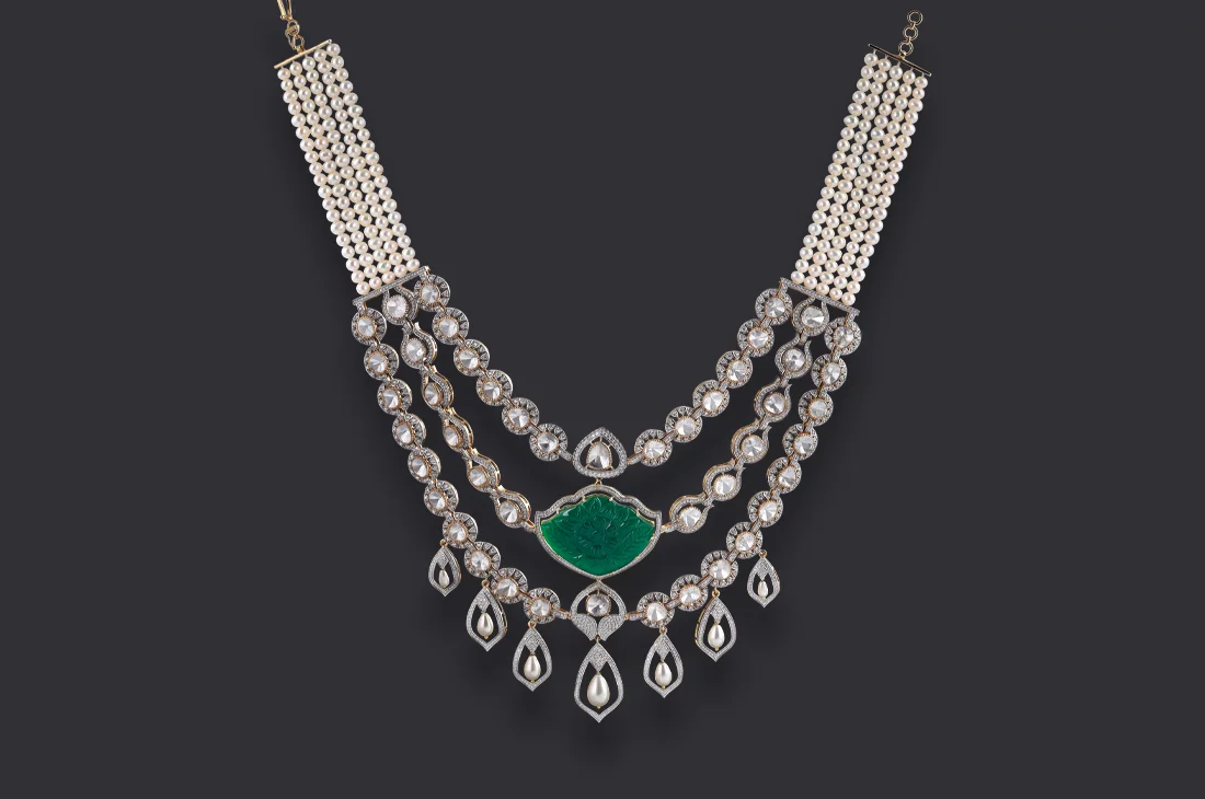 Three graceful strands of Haloed-Polki diamonds cascade into a carved emerald crest centerpiece, framed with teardrop pearl motifs. The design brings together symmetry and sculptural artistry, where every hand-set detail reflects precision and every stone radiates modern heirloom brilliance. Matching earrings complete the set, crafted to embody bridal legacy.