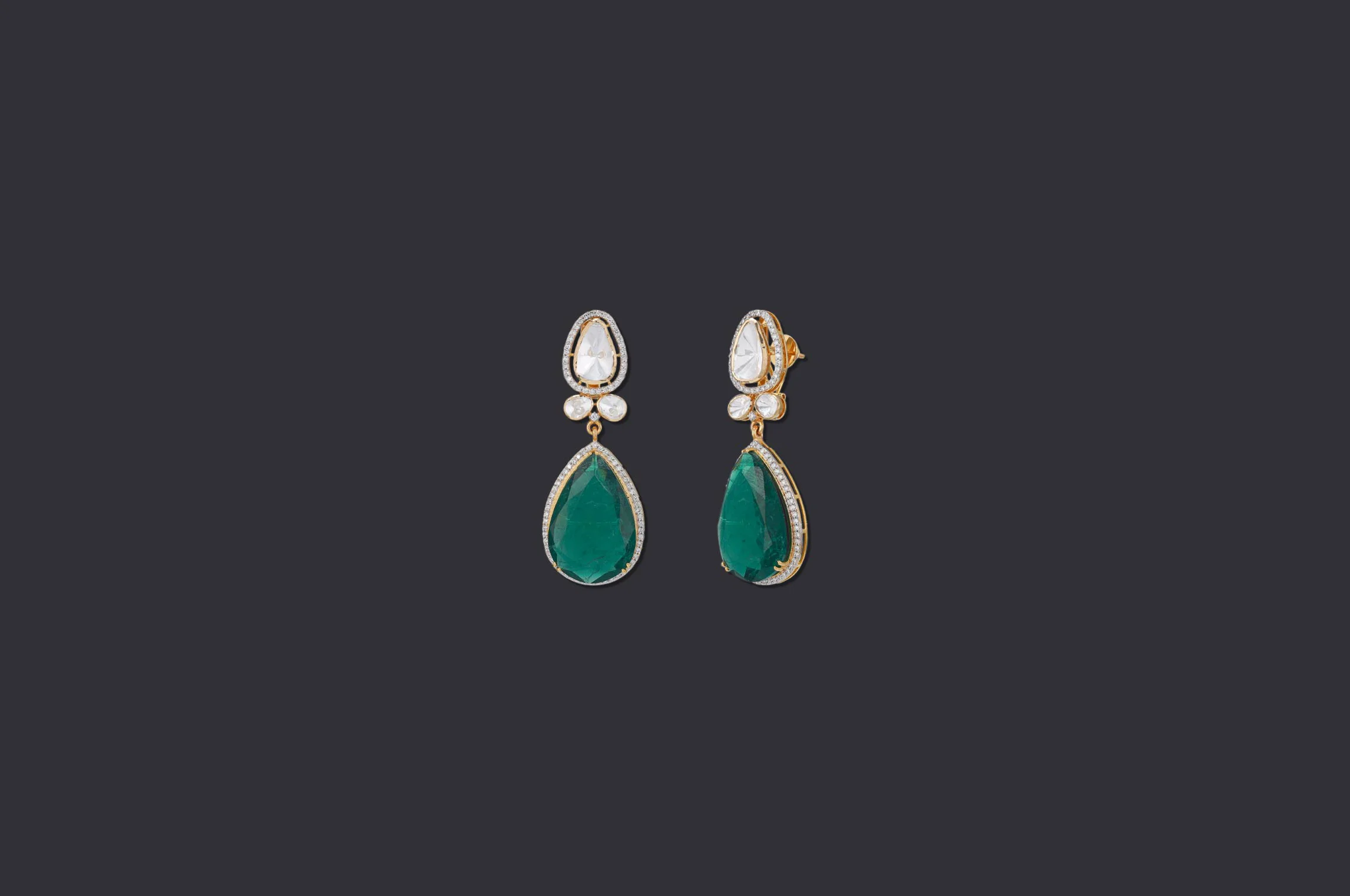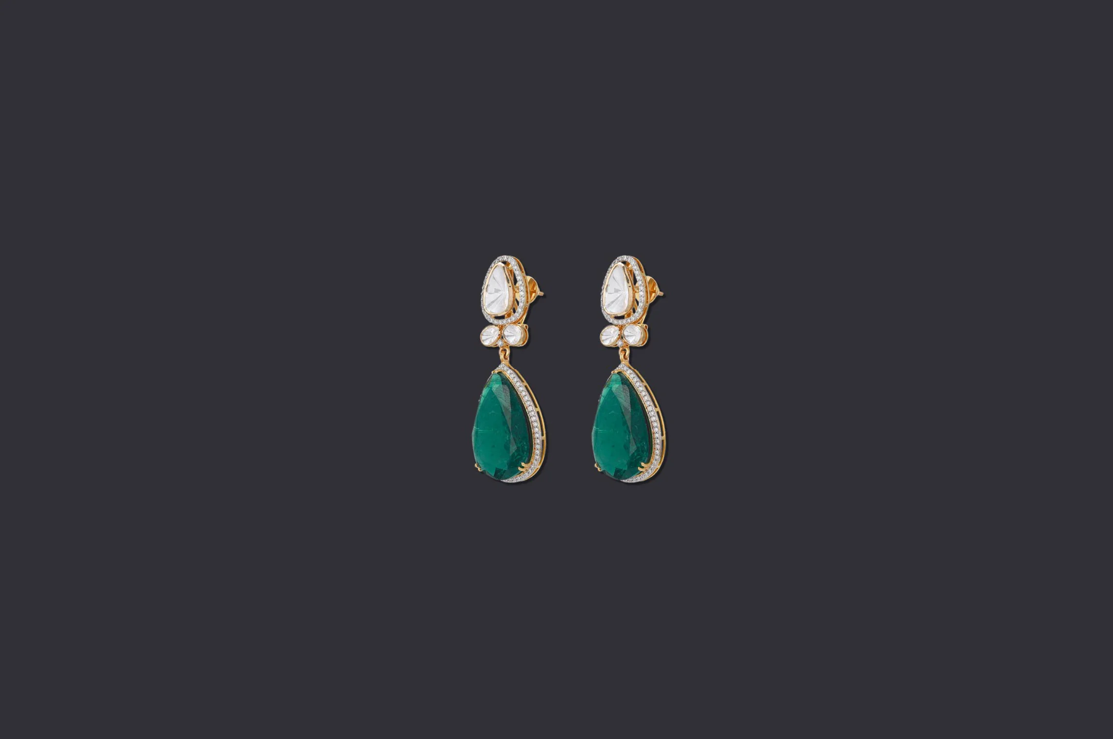 Polki diamonds crowned with lab-grown emerald drops, an encounter of heritage grandeur and refined geometry. The contrast of luminous white and vivid green creates a rare composition, crafted to endure as a jewel of permanence and prestige.