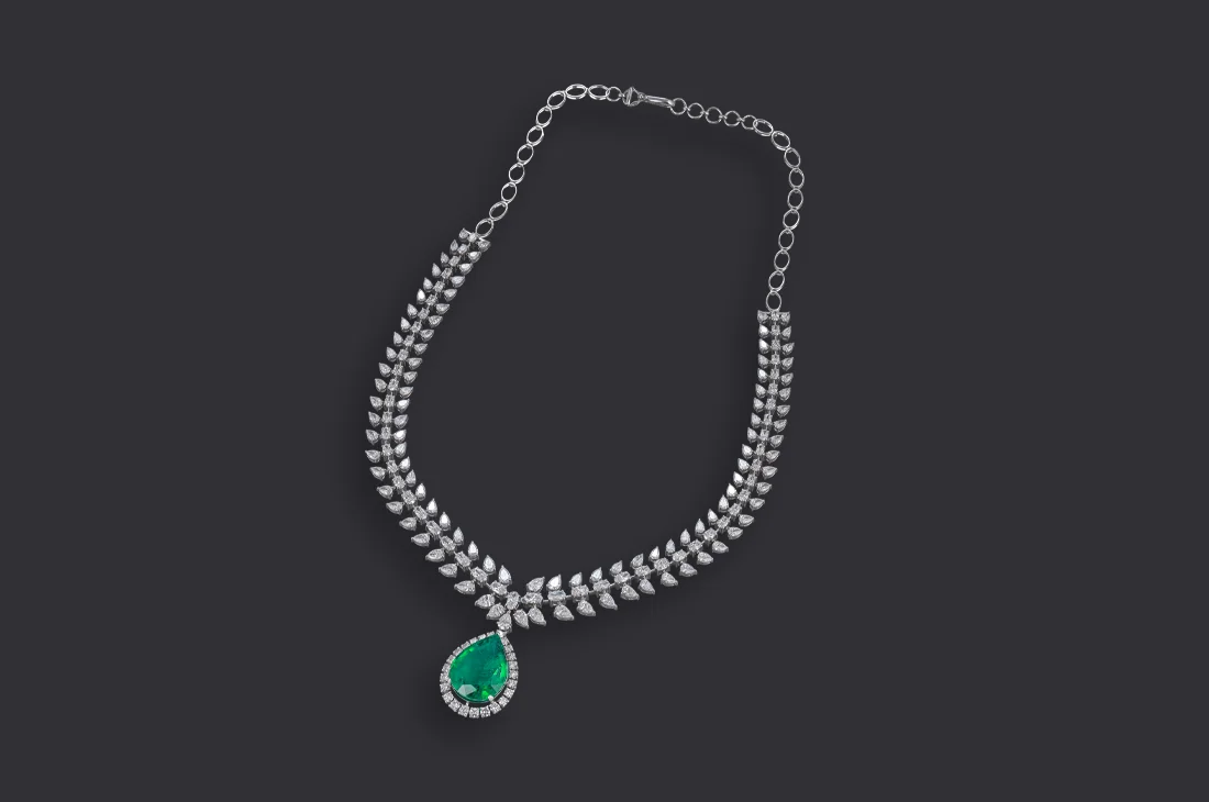 Twin rows of Pear-cut and Marquise-cut lab-grown diamonds taper gracefully towards a resplendent Pear-shaped Emerald centrepiece. The gem, encircled by a delicate diamond halo, radiates depth and vibrance, while its flawless symmetry embodies timeless sophistication. Matching earrings echo the grandeur, transforming the set into a portrait of enduring elegance and modern heirloom luxury.