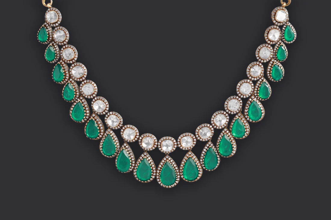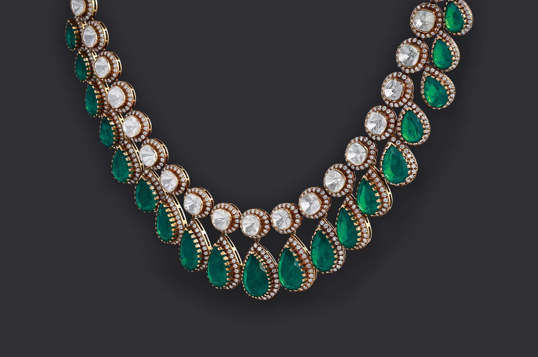 A luminous rhythm of Polki diamonds and emerald teardrops unfurls in perfect symmetry, each gem alive with fire and depth. Crafted with intricate precision, the necklace transforms heritage motifs into a bold statement of modern grandeur.