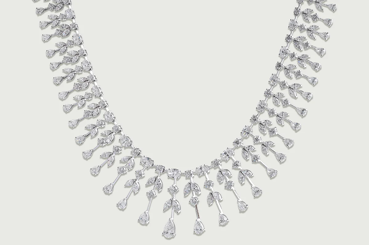 Clusters of pear and round lab-grown diamonds form delicate drop motifs, each suspended to create a natural, dew-like rhythm.