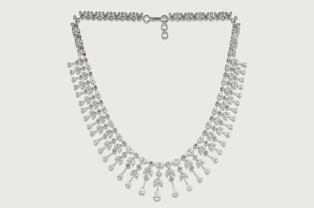 Airy and refined, the design frames the neckline with a sense of effortless radiance; an ode to moments that feel eternal.