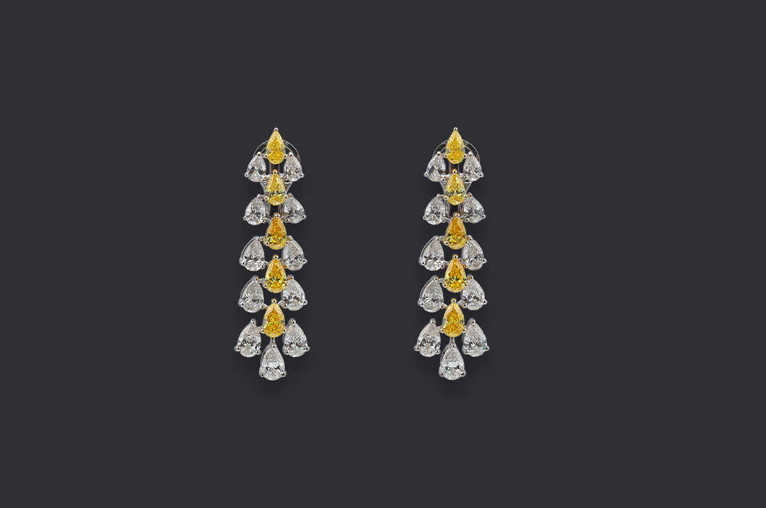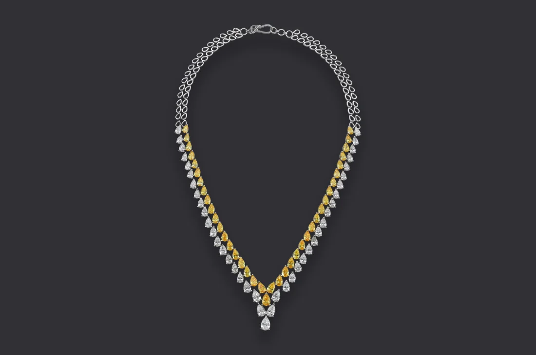 A precise V-shaped silhouette drapes the décolletage in rhythmic strands of yellow and white diamonds. The gradual transition of color evokes the bloom of daybreak, moving from the brilliance of dawn to the clarity of day. Paired with elongated earrings, the set creates a portrait of fluid modernity, radiant yet timeless.