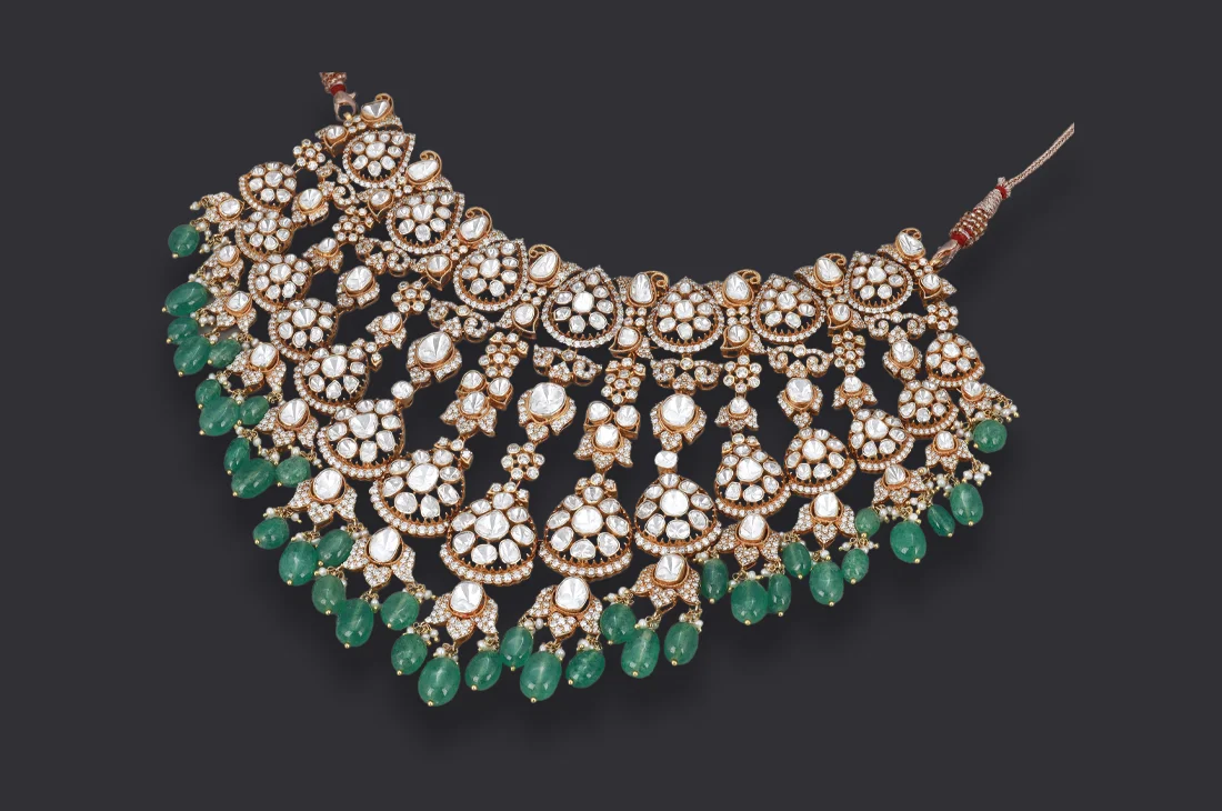 A masterpiece of bridal artistry, this necklace is crafted with uncut Polki diamonds arranged in ornate clusters and cascades, finished with vivid emerald drops. Every element is hand-set with precision, reflecting the grandeur of heritage design while embodying the innovation of lab-grown craftsmanship. Paired with matching earrings, it stands as a celebration of legacy, light, and the joy of a bride’s most treasured occasion.