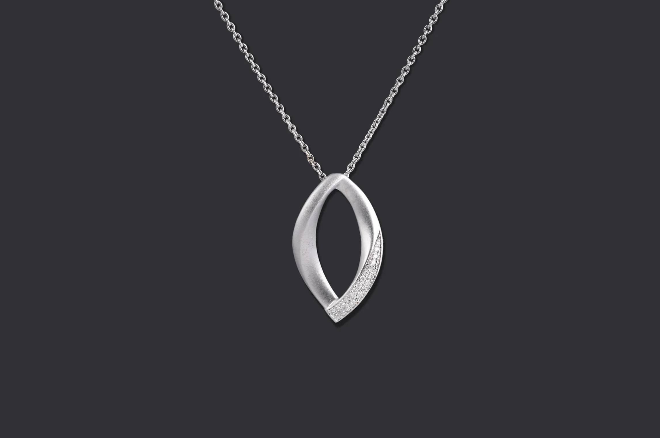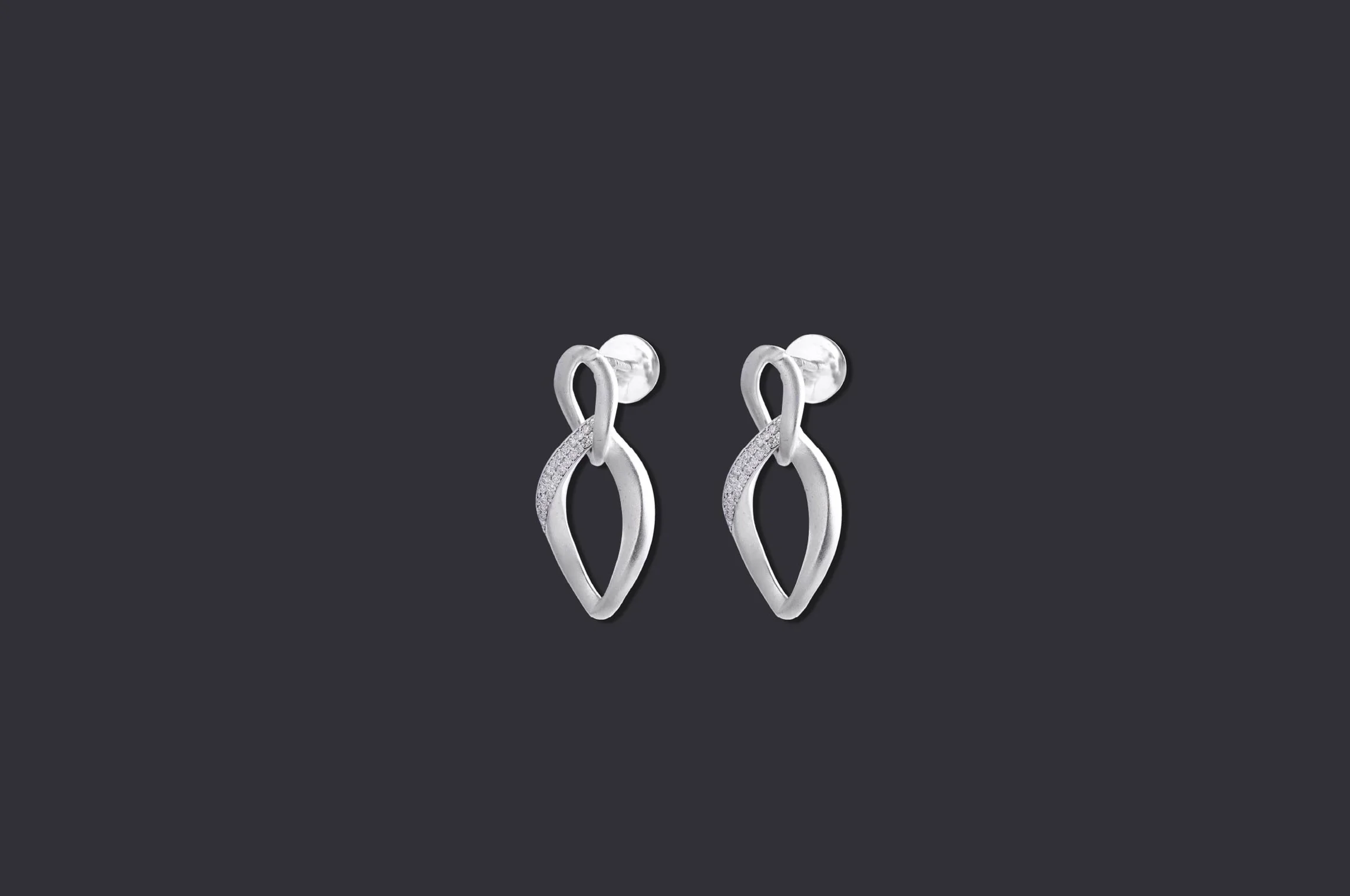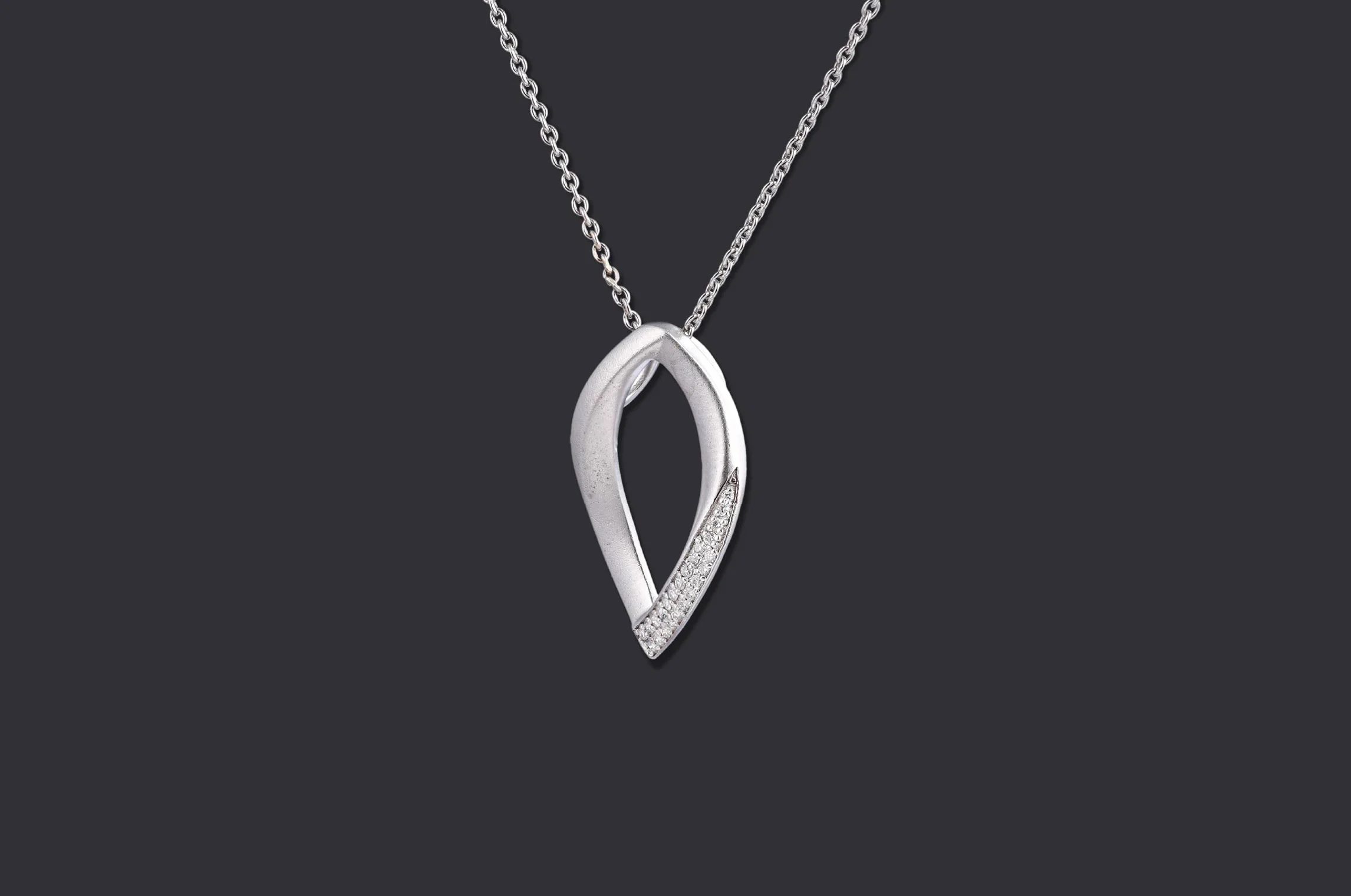 A sculptural pendant and earrings set in white gold, crafted in a modern infinity loop accented with pavé diamonds. Its sleek matte-polish finish and subtle sparkle symbolize continuity and elegance, designed for women who prefer contemporary artistry in their daily essentials.