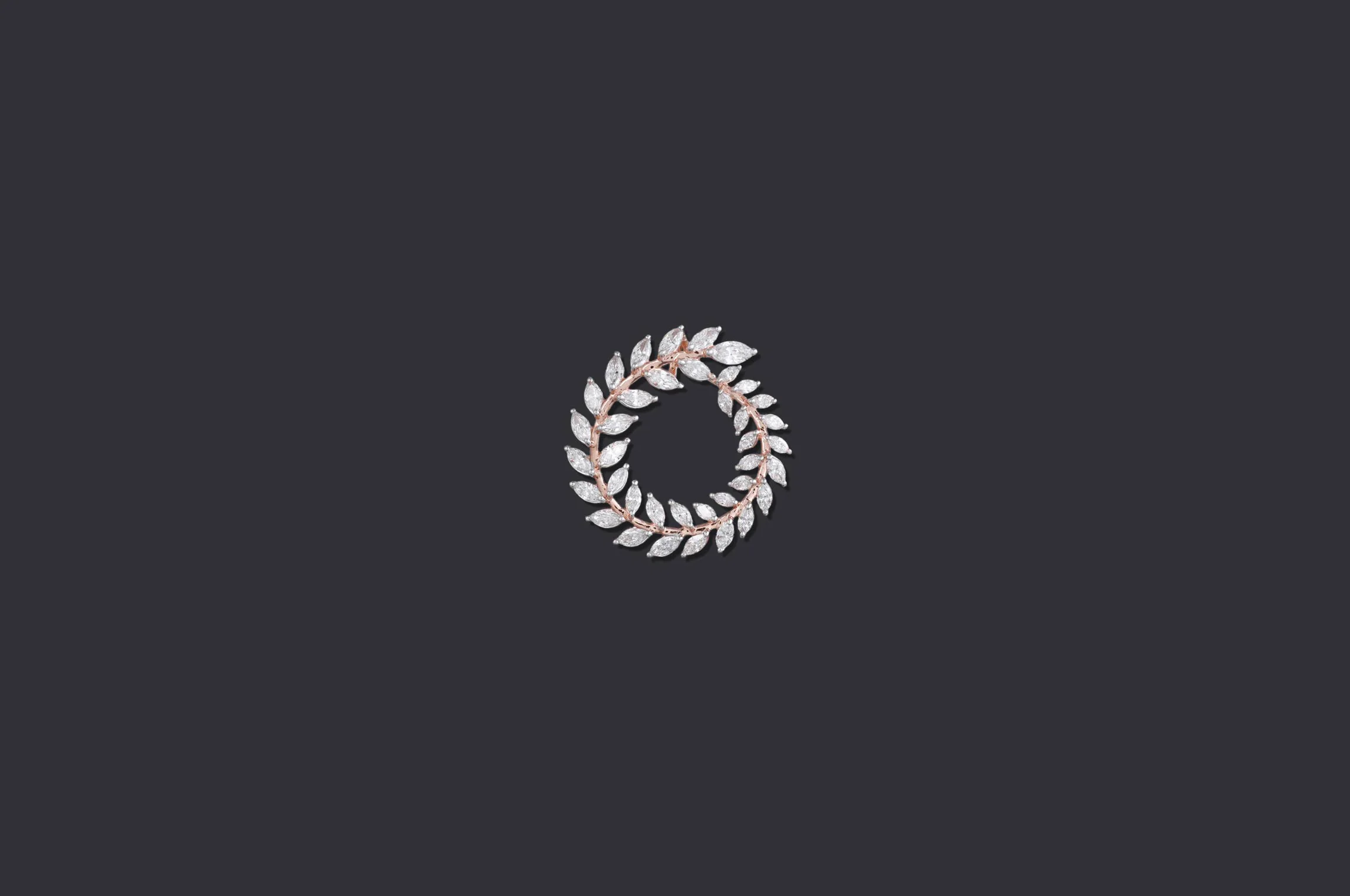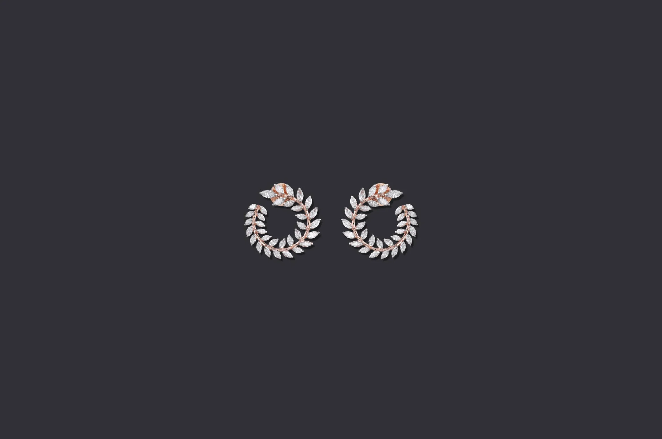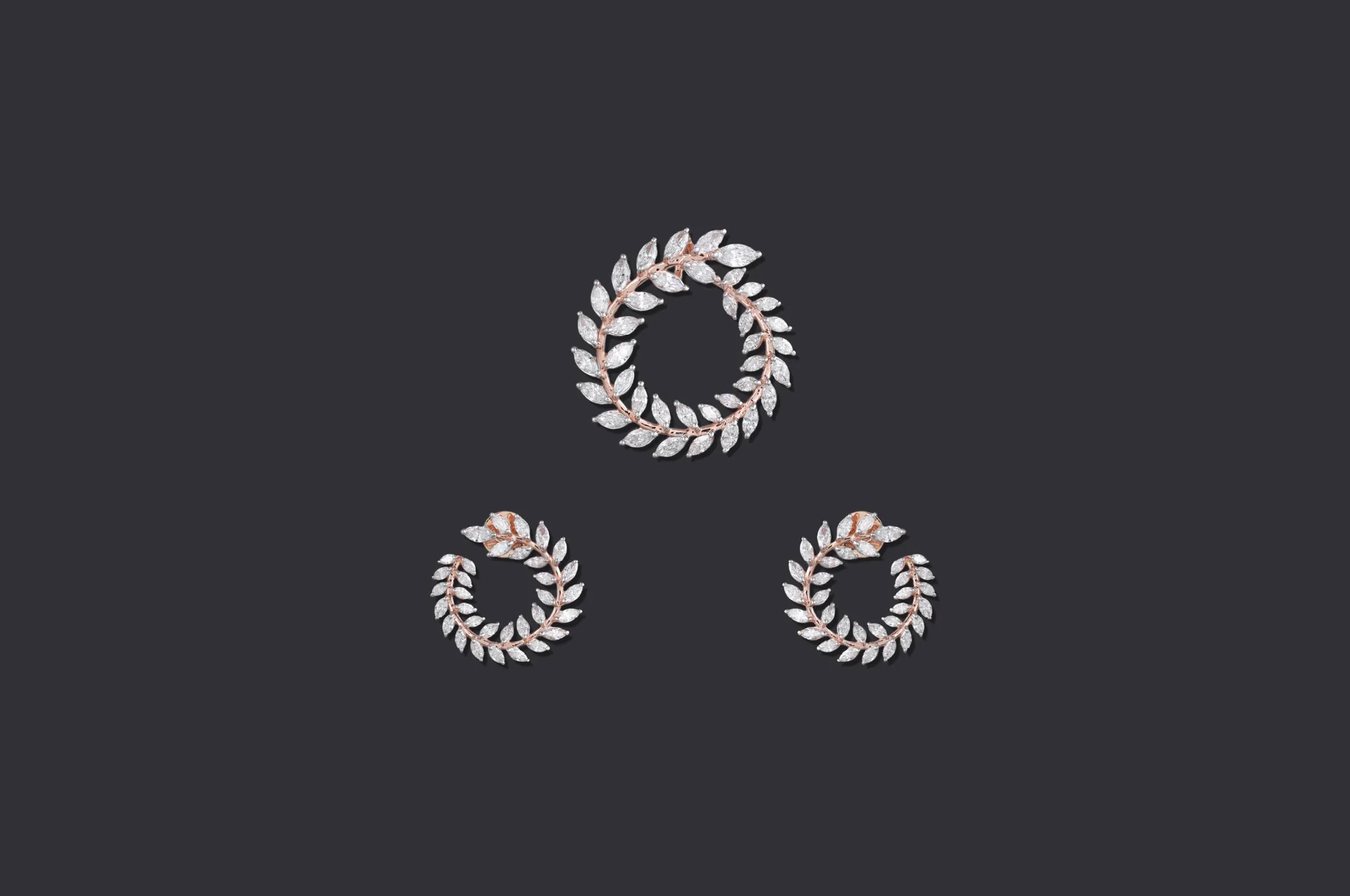 Inspired by eternal triumph, this pendant-and-earring set is crafted with marquise diamonds arranged in a wreath silhouette, accented with rose gold veins. A poetic interpretation of victory and grace, ideal for festive gatherings.