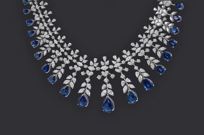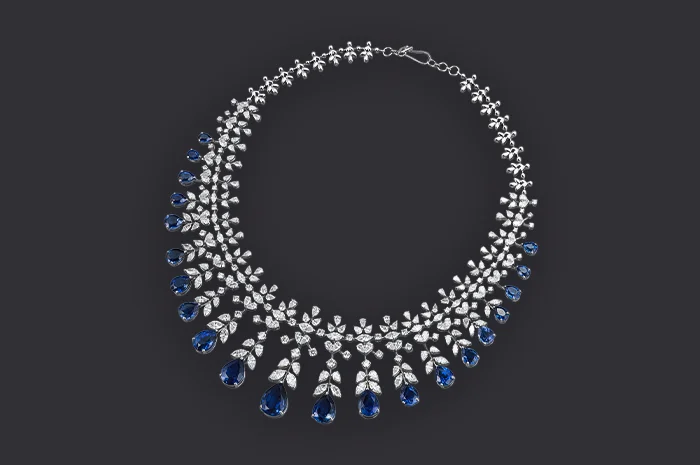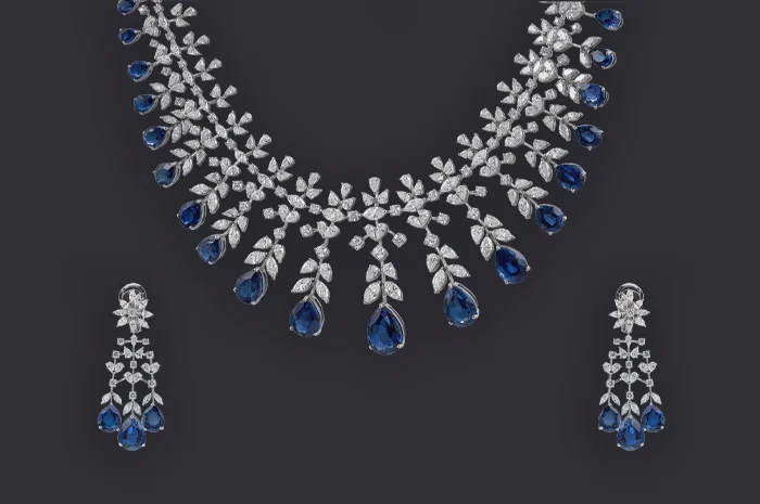 A luminous constellation of lab-grown diamonds unfurls into cascades of deep blue gemstones; each drop reminiscent of starlight against a midnight sky. Crafted with intricate precision, the necklace and earrings capture the poetry of the cosmos; where brilliance meets color in an eternal expression of elegance.