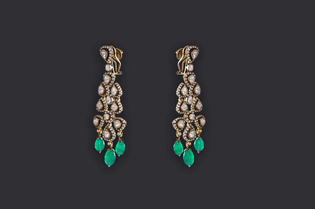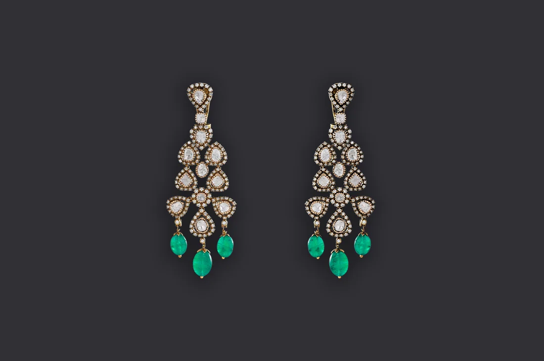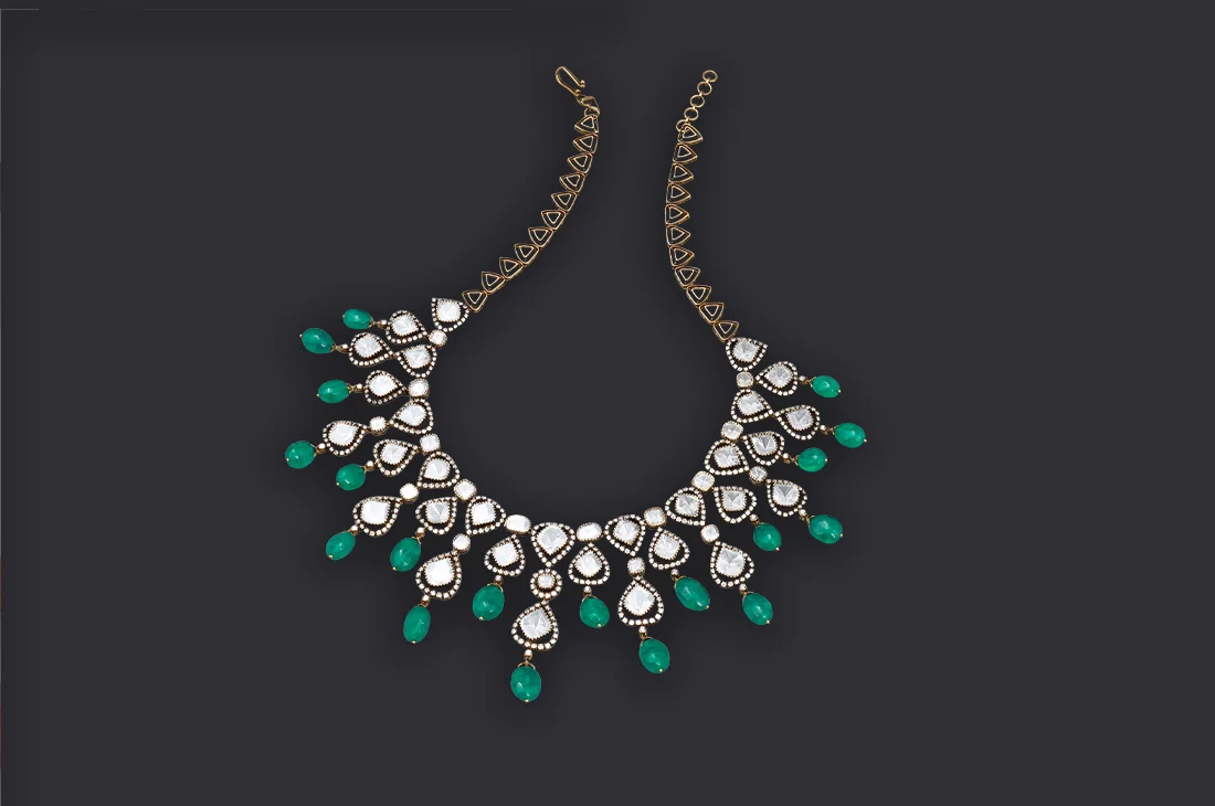Pear-shaped Polki diamonds bloom alongside vibrant emerald drops, forming a garland of light and color. The open framework allows brilliance to flow seamlessly, lending the piece a sculptural and timeless quality.