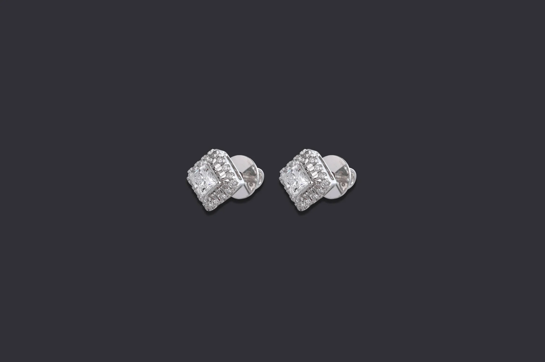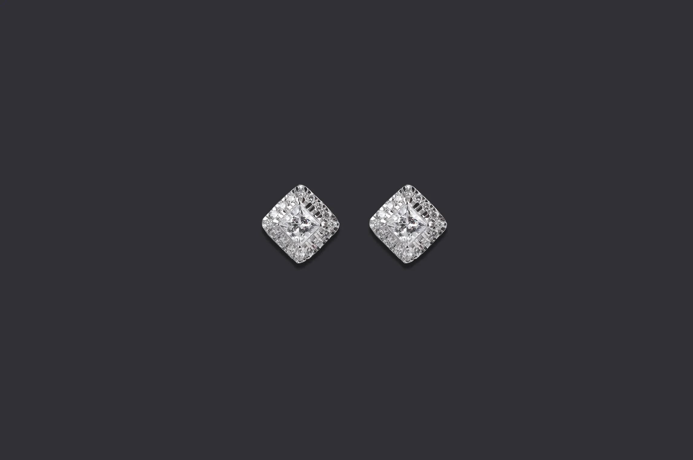 A pair of princess-cut lab-grown diamonds, framed in delicate halos of pavé-set stones, bring geometric brilliance to everyday wear. Their sharp symmetry balanced by soft halos creates a timeless sparkle; sophisticated yet versatile.