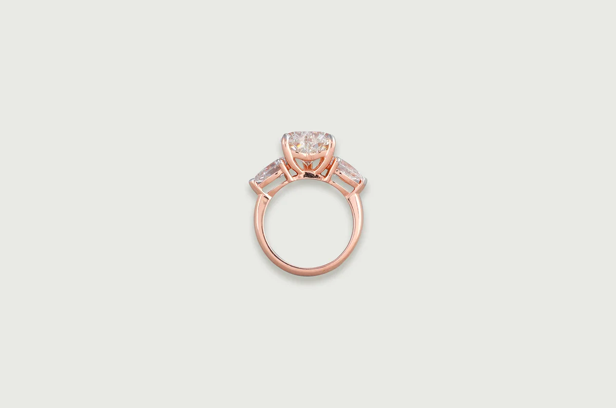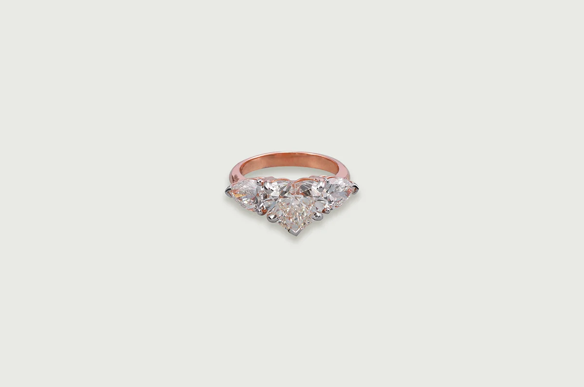A heart-shaped lab diamond is flanked by two pear-cut stones, set on a soft rose-gold band: romantic, sculptural, effortlessly expressive.