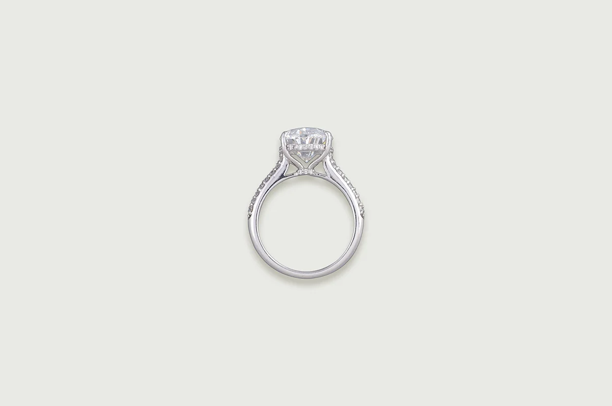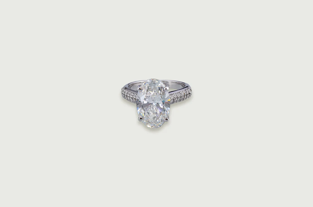 An elongated oval-cut lab diamond sits on a pavé band of white gold, creating a light-catching silhouette that feels clean, elongated and quietly dramatic.