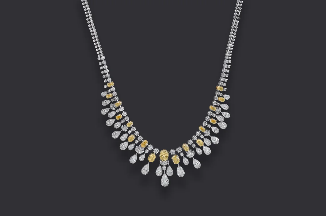 Clusters of pear-shaped white diamonds unfurl like petals around vibrant yellow diamonds, each gem echoing the golden glow of a rising sun. The composition forms a coronet of light across the neckline, where every facet sings in harmony — bold, jubilant, and regal.