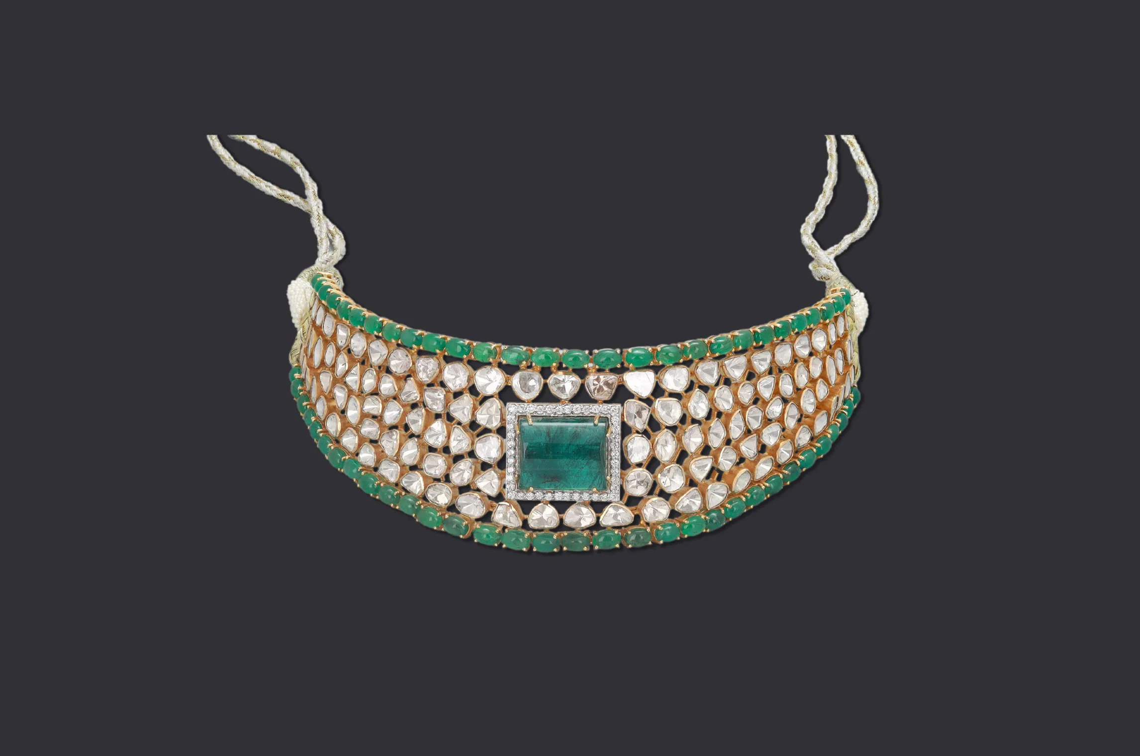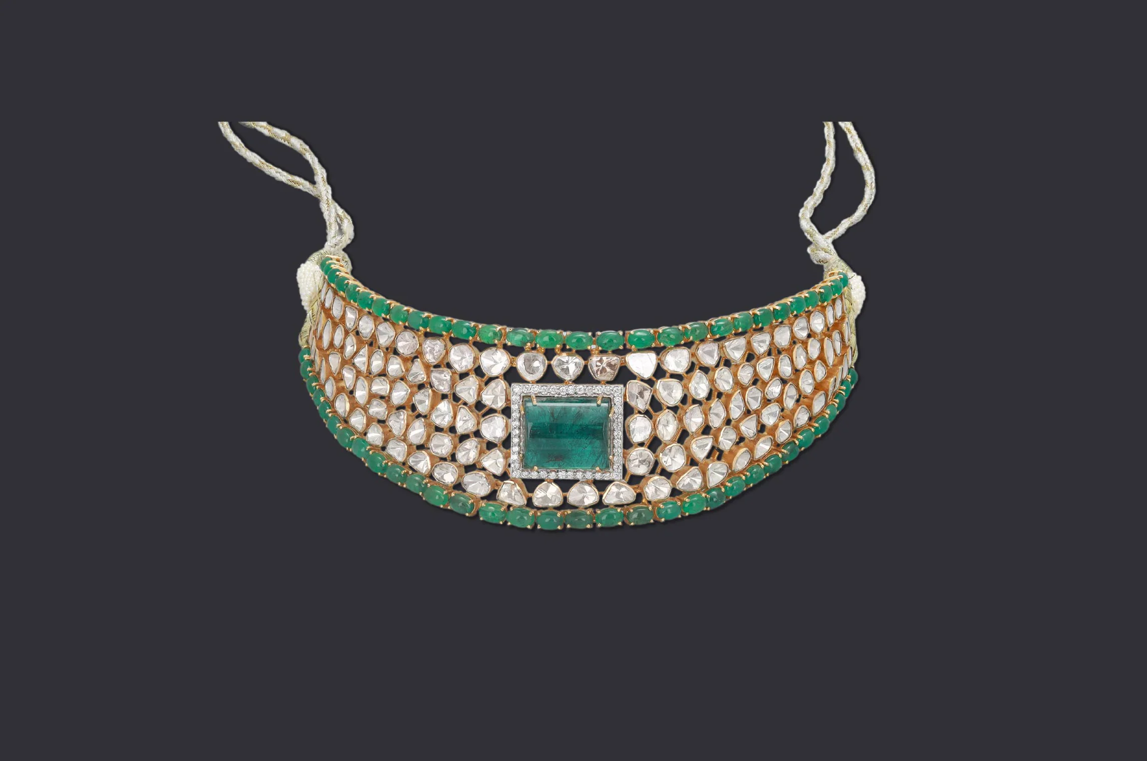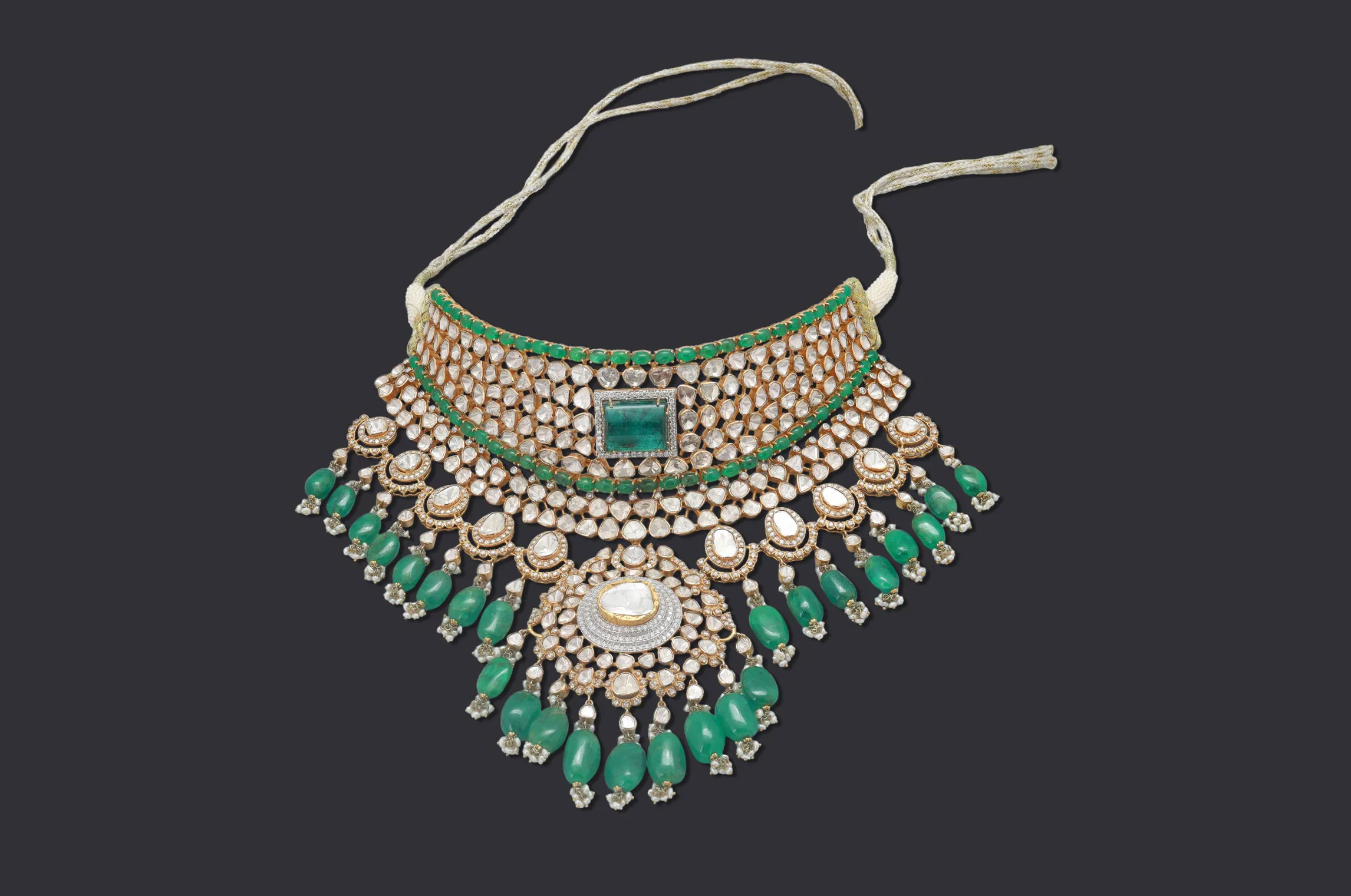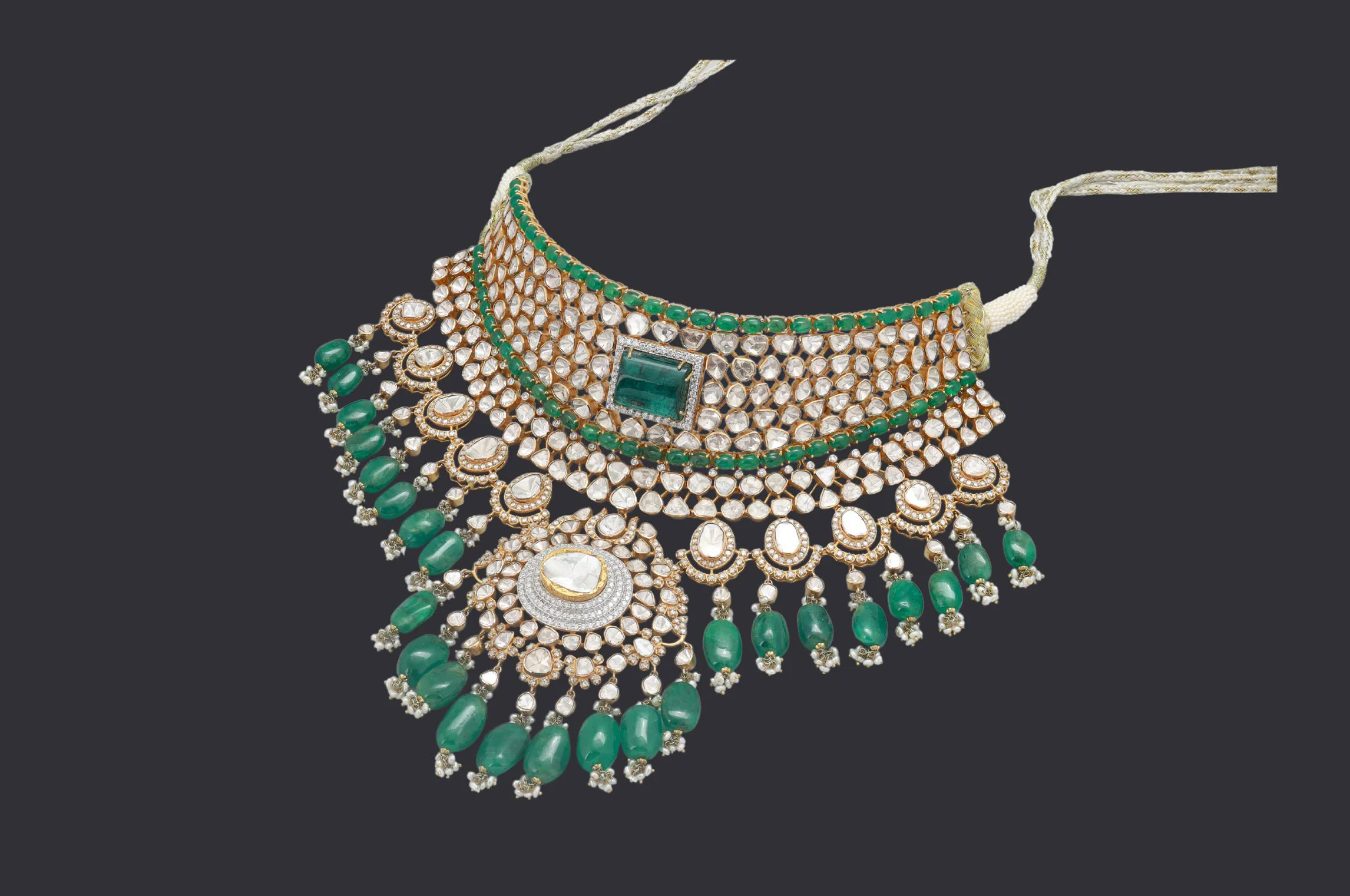 An heirloom crafted for eternity, this masterpiece features lab-grown Polki diamonds and vivid emeralds arranged in intricate layers. Designed with detachable versatility, it transforms seamlessly into three distinct styles—each revealing a new facet of its brilliance. A jewel that honors the bride’s most cherished day while living on as a timeless companion beyond it.