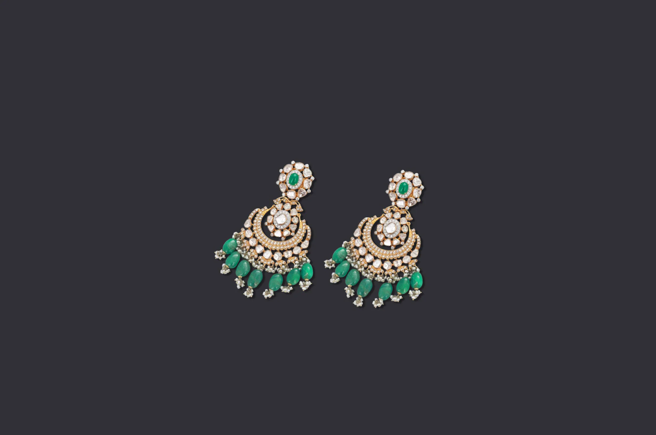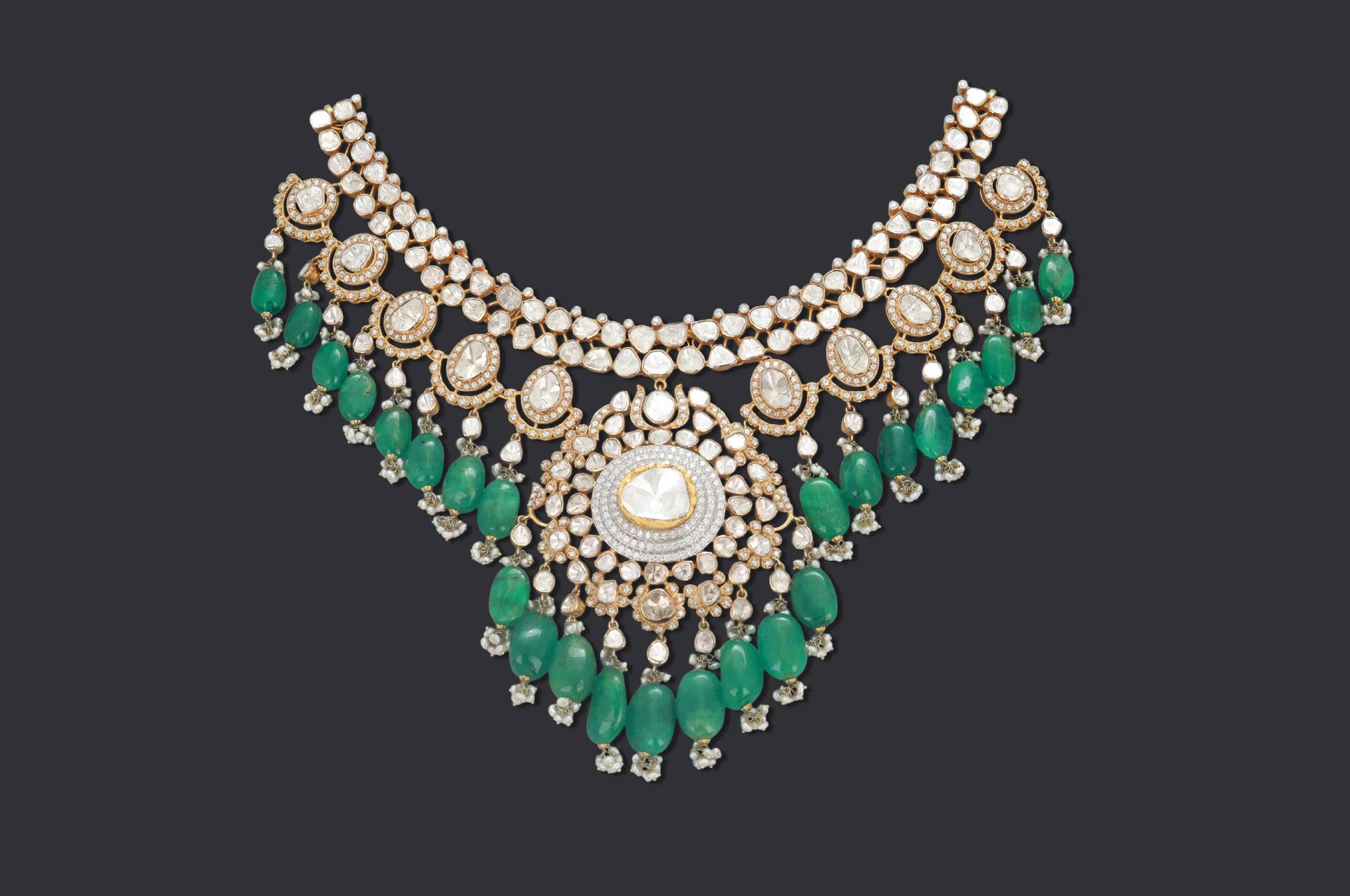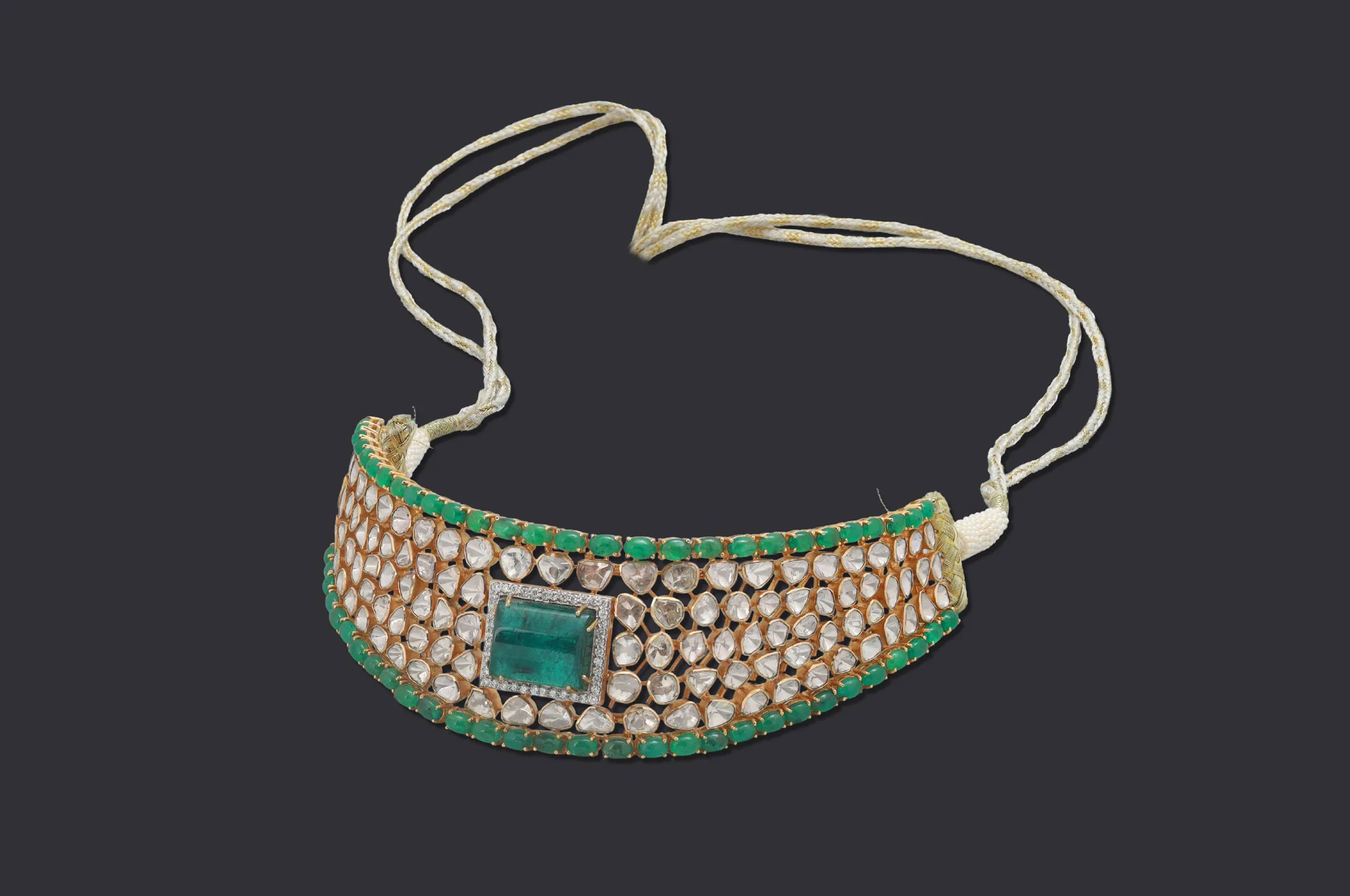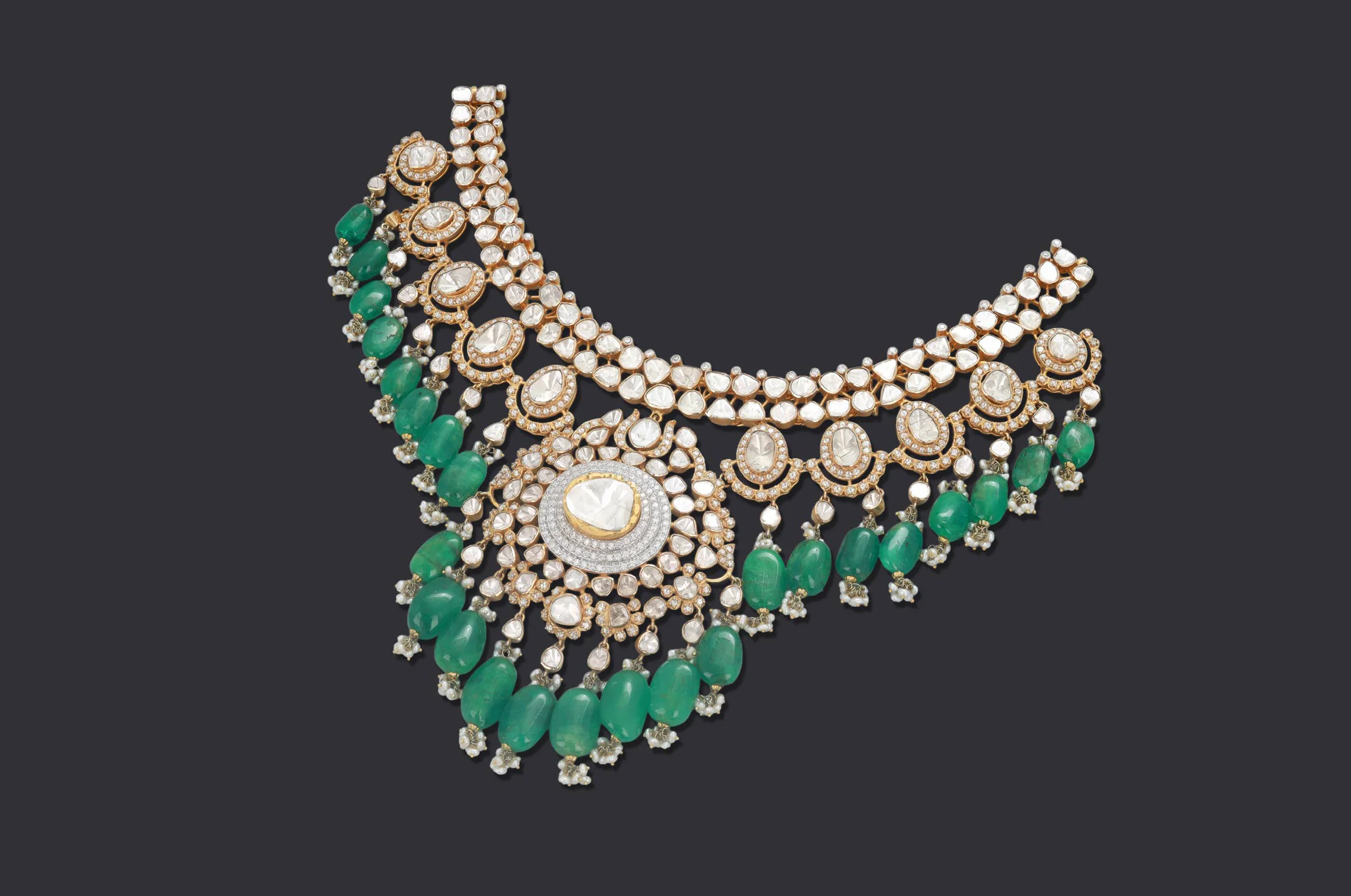 An heirloom crafted for eternity, this masterpiece features lab-grown Polki diamonds and vivid emeralds arranged in intricate layers. Designed with detachable versatility, it transforms seamlessly into three distinct styles—each revealing a new facet of its brilliance. A jewel that honors the bride’s most cherished day while living on as a timeless companion beyond it.