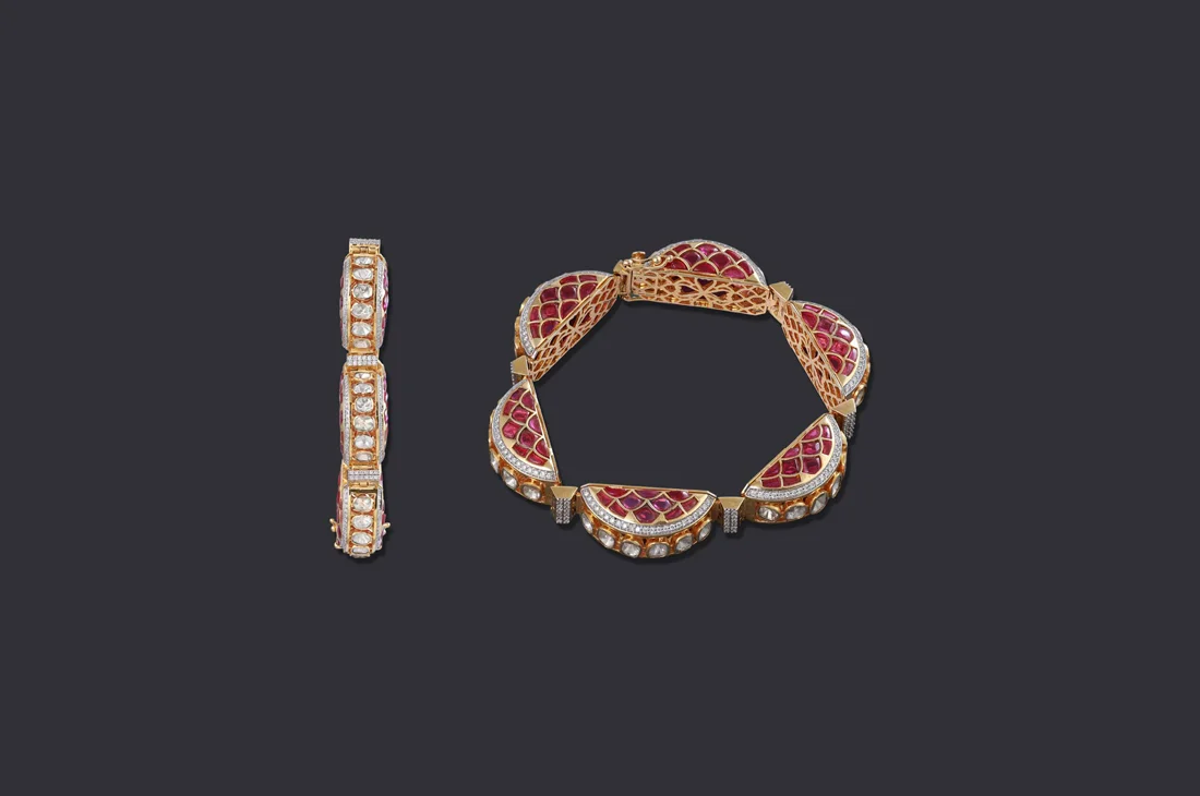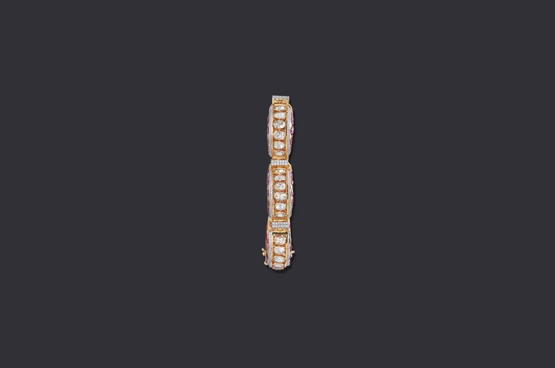 Polki diamonds are strung in perfect rhythm, bordered by ruby talaff detailing; an ancient art of cutting and shaping rubies into precise, interlocking forms. The meticulous handwork, both intricate and time-intensive, creates a bracelet that is as much a feat of craftsmanship as it is a jewel of enduring brilliance.