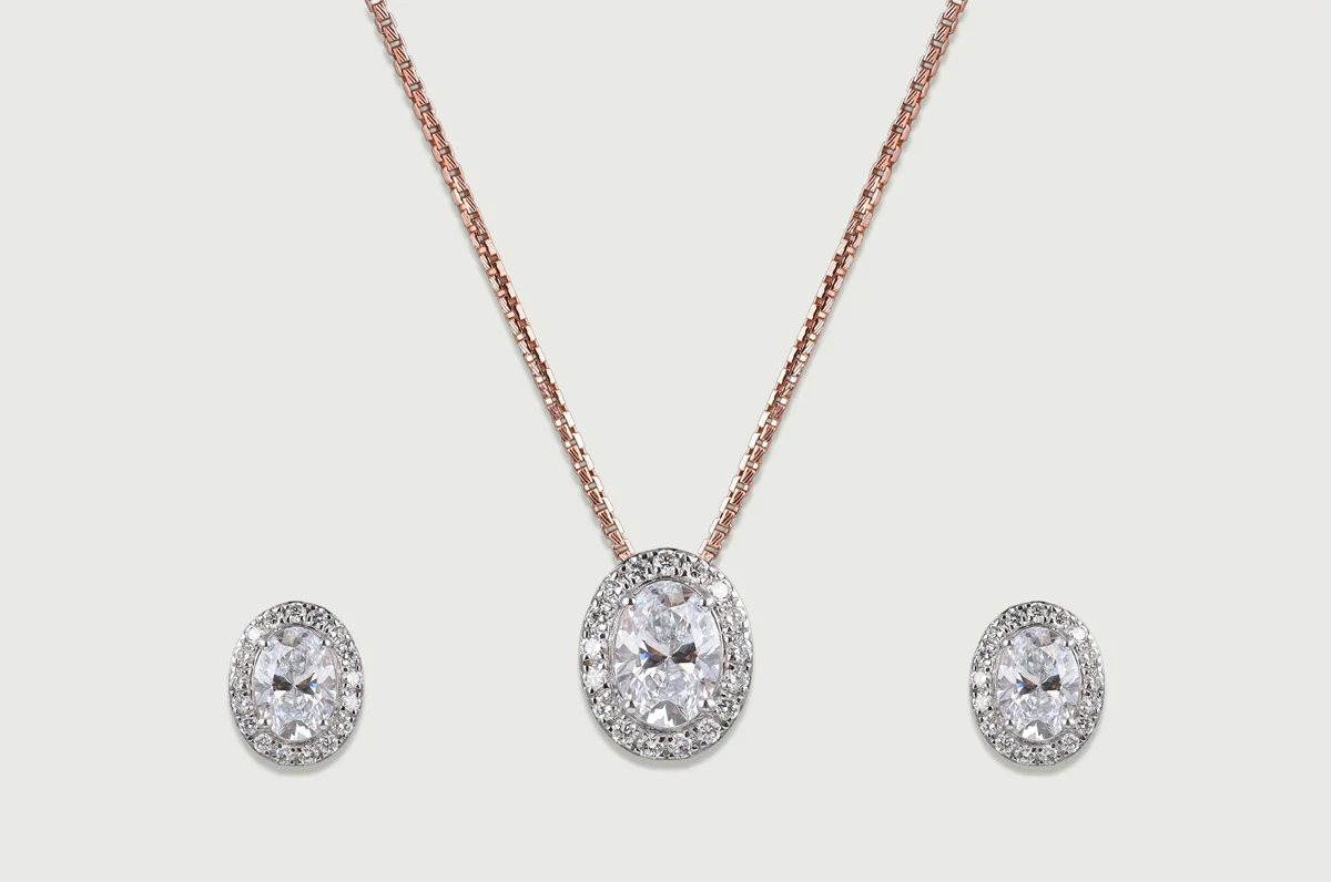 Suspended on a sleek chain with matching studs, the set offers a refined balance of sparkle and simplicity; perfect for daily wear with a touch of grace.