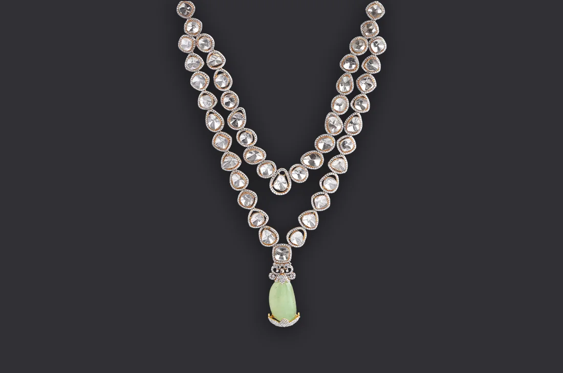 Rows of asymmetrical Polki diamonds are strung in open setting, flowing into a single green Russian emerald drop. A celebration of proportion and purity, where each stone’s individuality contributes to the harmony of the whole.