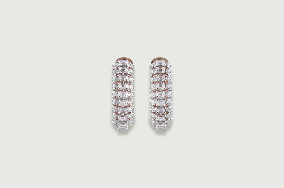 Rows of baguette-cut lab diamonds curve seamlessly around the hoop, enhanced with pavé accents for added depth. A polished dual-tone finish elevates the look—professional, modern, and beautifully versatile.