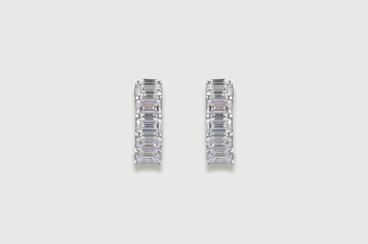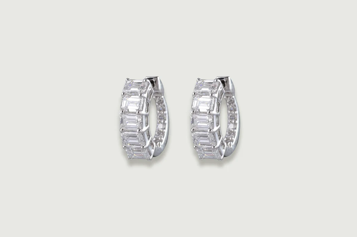 A full row of emerald-cut lab diamonds frames the hoop with uninterrupted precision. Light reflects cleanly across every facet, creating a look that is both contemporary and powerfully understated.